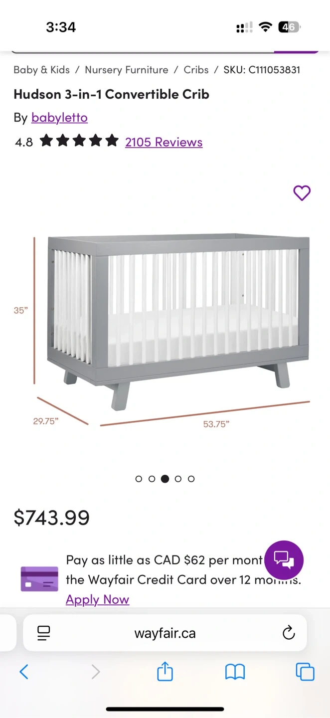 15Selling a Babyletto Hudson 3-in-1 Convertible Crib. The crib is in great condition and ready for a new home. From the screenshot, it retails for $743.99. Dimensions are 35" height, 29.75" depth, and 53.75" width In good condition with some bit marks on only one top inside part of crib piece. Nothing some wood paint in grey can’t fix. Pick up only near Landsdowne mall in Richmond.