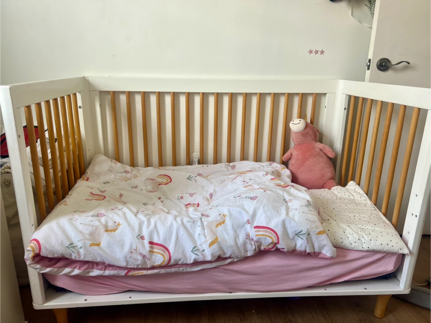Babyletto Lolly 3-in-1 Convertible Crib - White & Birch - Great Condition! Price: $200 Description: Selling our beautiful Babyletto Lolly 3-in-1 Convertible Crib in a classic white and birch finish. This crib is in great, used condition from a smoke-free and pet-free home. It's a high-quality, modern crib that's perfect for any nursery. Key Features: • Color: White and birch • Condition: Good used condition • Safety: JPMA certified, non-toxic finish • Included: All original parts and hardware are included. • Convertible: Easily converts to a toddler bed and daybed (toddler rail included). • Bonus: A mattress is also available if you're interested. The crib is already disassembled and ready for easy pickup. Please send me a message if you'd like to arrange a time to see it or if you have any questions.