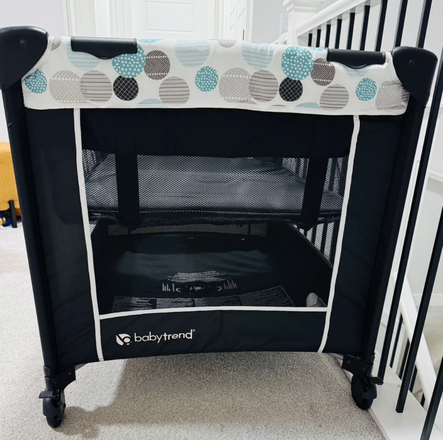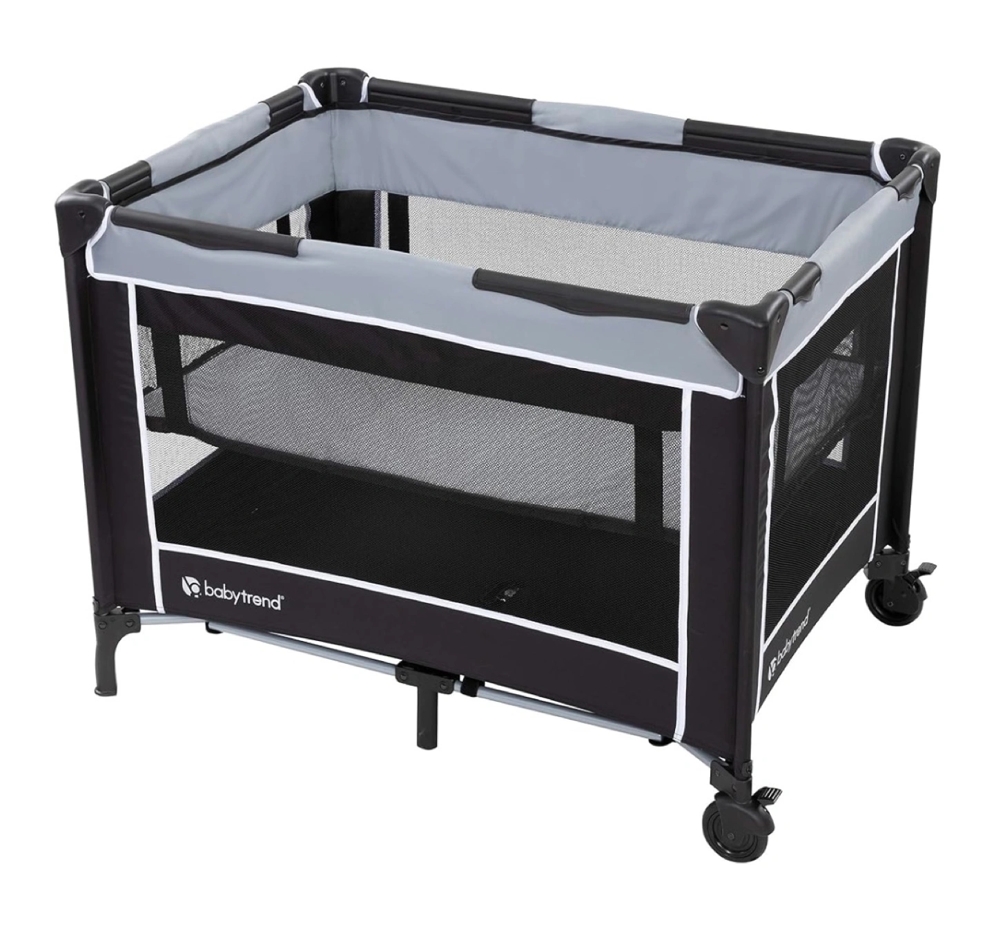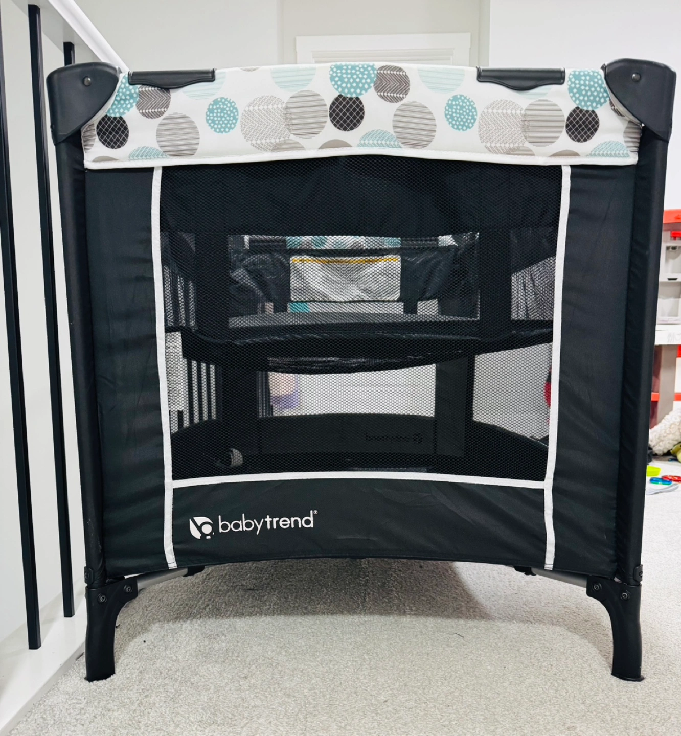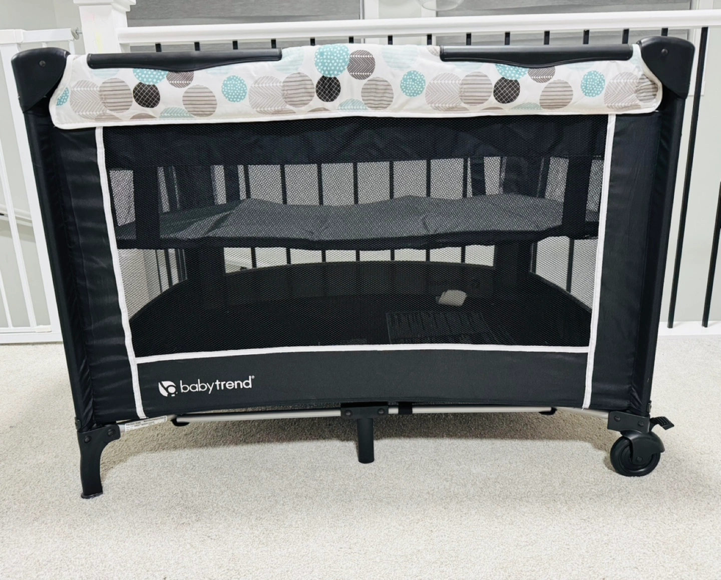 Playard with wheels and a carrying bag. Grey and blue colour scheme. Very good condition . 2 adjustable heights .