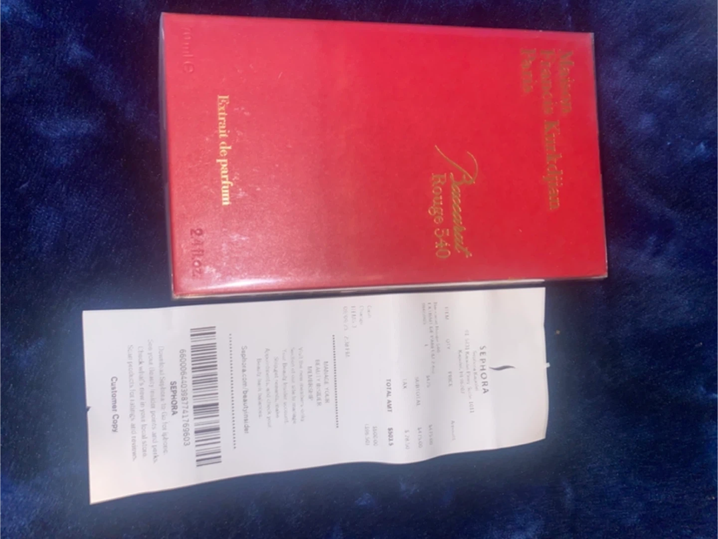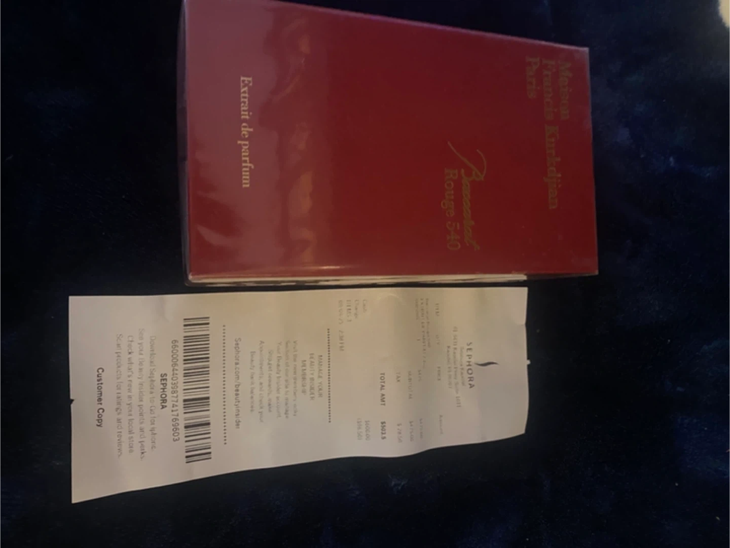 Selling a bottle of Baccarat Rouge 540 Extrait de Parfum. The box is included. The receipt shows the original price was $625.00