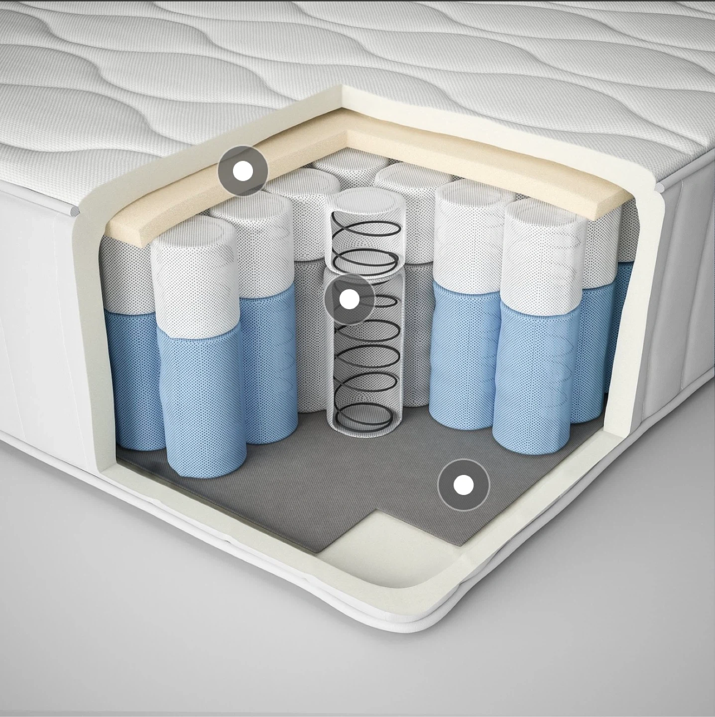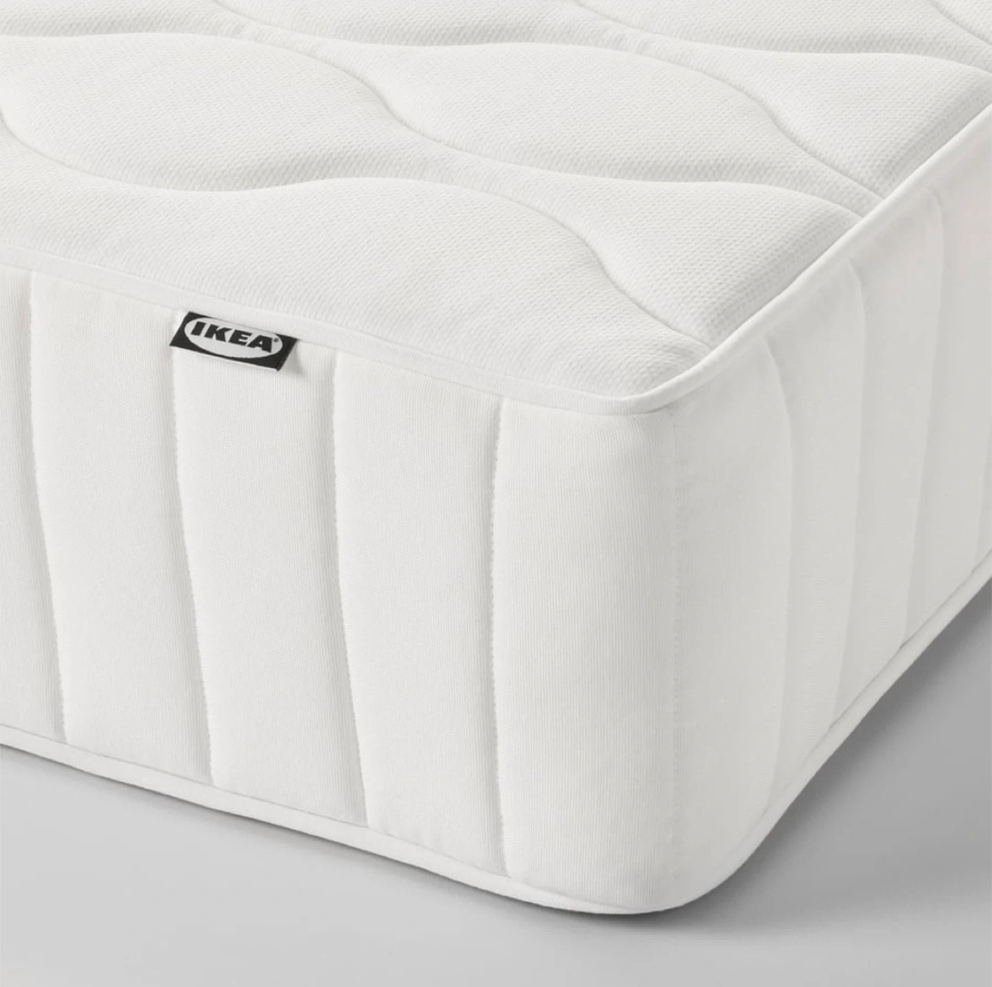 This IKEA mattress features pocket sprung technology for support and comfort. It has a quilted white fabric cover. A good choice for a restful sleep!
