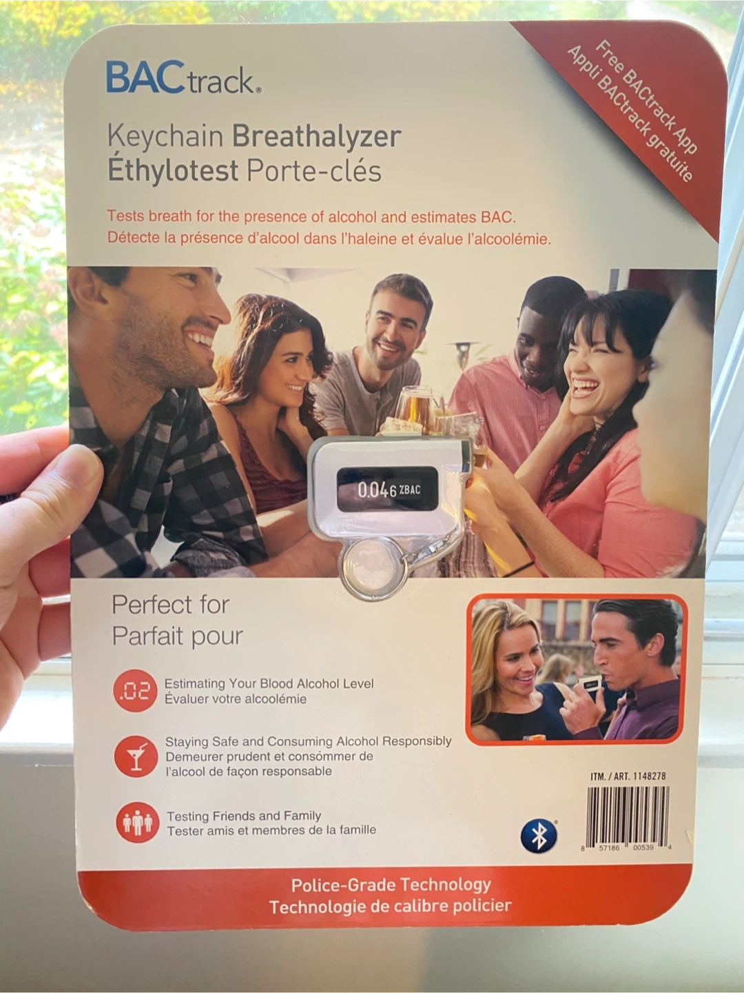 95Selling a brand new BACtrack Keychain Breathalyzer, still in its original packaging! It's perfect for estimating your blood alcohol level and staying safe while consuming alcohol. The package includes reusable mouthpieces and a AAA battery. Originally bought for $99.99 but never used