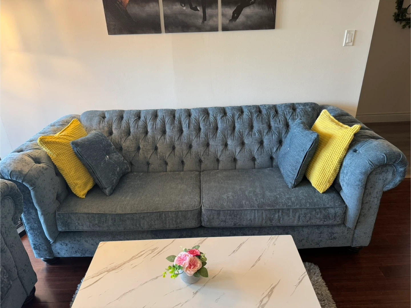 34Selling a beautiful Bad Boy sofa and armchair set! The set features a classic design with a luxurious teal blue velvet upholstery. It would be a great addition to any living room or sitting area! The set is in great condition and ready for a new home