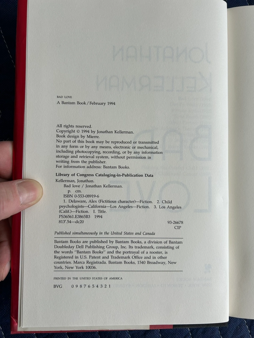 Selling the book Bad Love by Jonathan Kellerman, an Alex Delaware Novel. It is a Bantam Book, published in February 1994. Copyright 1994 by Jonathan Kellerman. Great read for anyone interested in fiction!