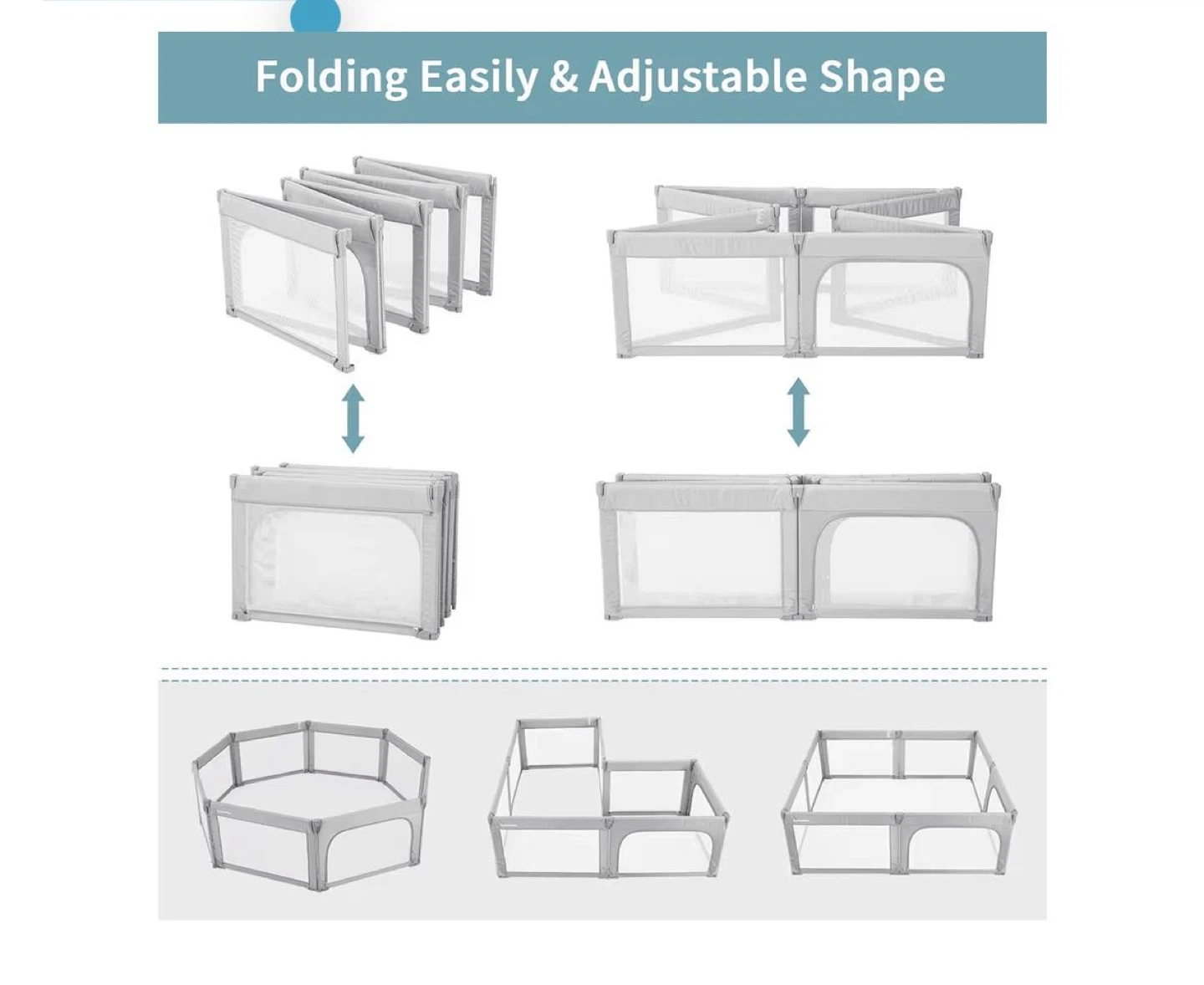This grey folding playpen is adjustable and can be configured in various shapes. It's made with breathable mesh and a sturdy frame for safety. Perfect for keeping little ones contained and entertained!