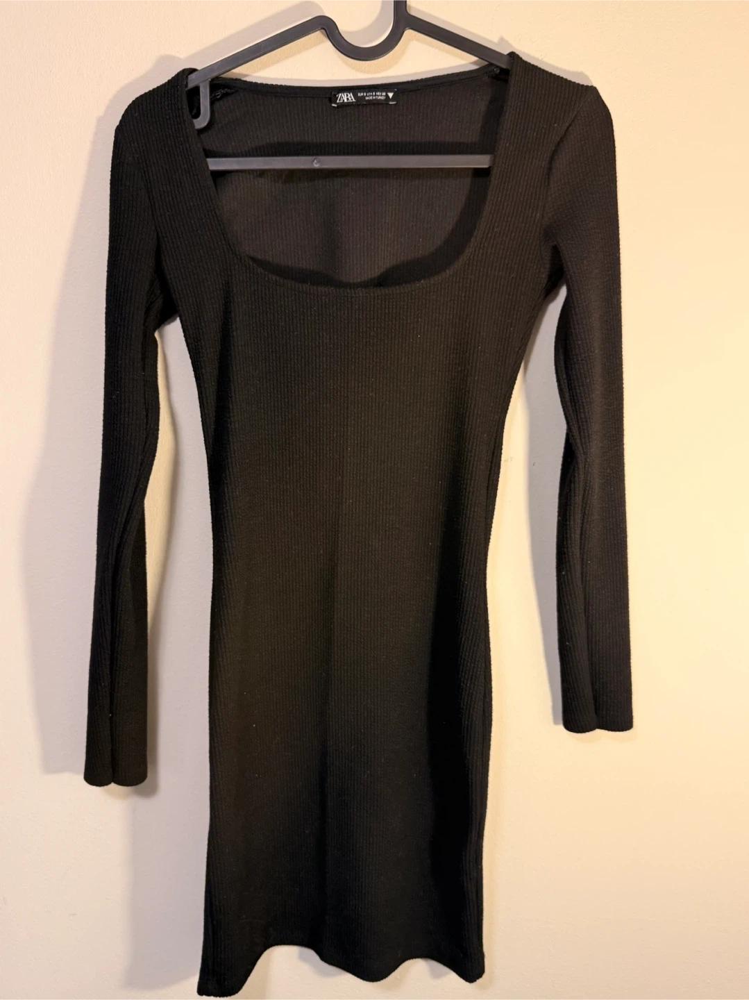 This is a black, long-sleeved mini dress from Zara. It's made of a ribbed knit material with a square neckline. It's a form-fitting style.