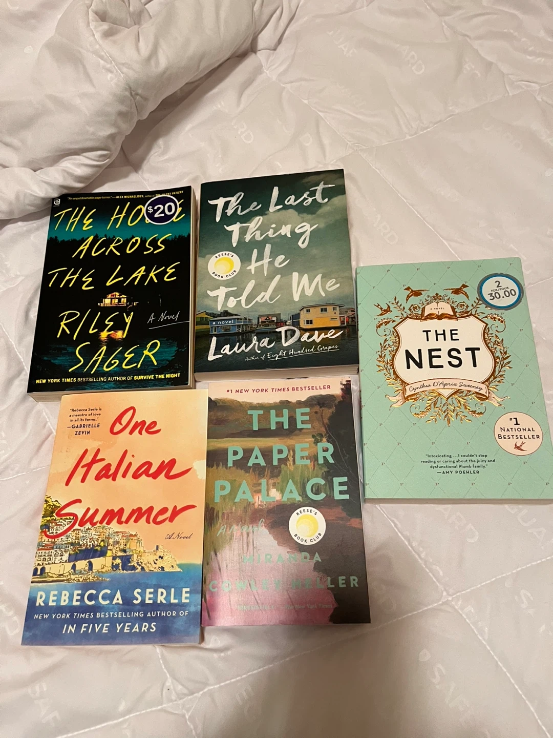 Five paperback novels, including titles by Riley Sager, Laura Dave, Cynthia D'Aprix Sweeney, Rebecca Serle, and Miranda Cowley Heller. Authors include New York Times bestselling authors. These books are great for readers who enjoy thrillers and contemporary fiction.