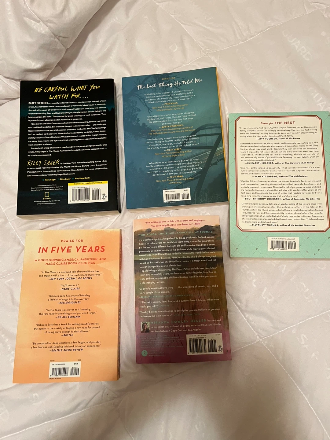 Five paperback novels, including titles by Riley Sager, Laura Dave, Cynthia D'Aprix Sweeney, Rebecca Serle, and Miranda Cowley Heller. Authors include New York Times bestselling authors. These books are great for readers who enjoy thrillers and contemporary fiction.