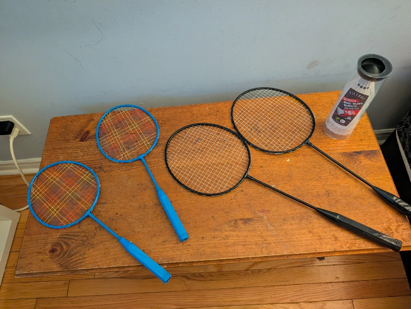 131Selling four badminton rackets, two with black frames and one with a blue frame. Also included is a tube of shuttlecocks, so you're ready to play!