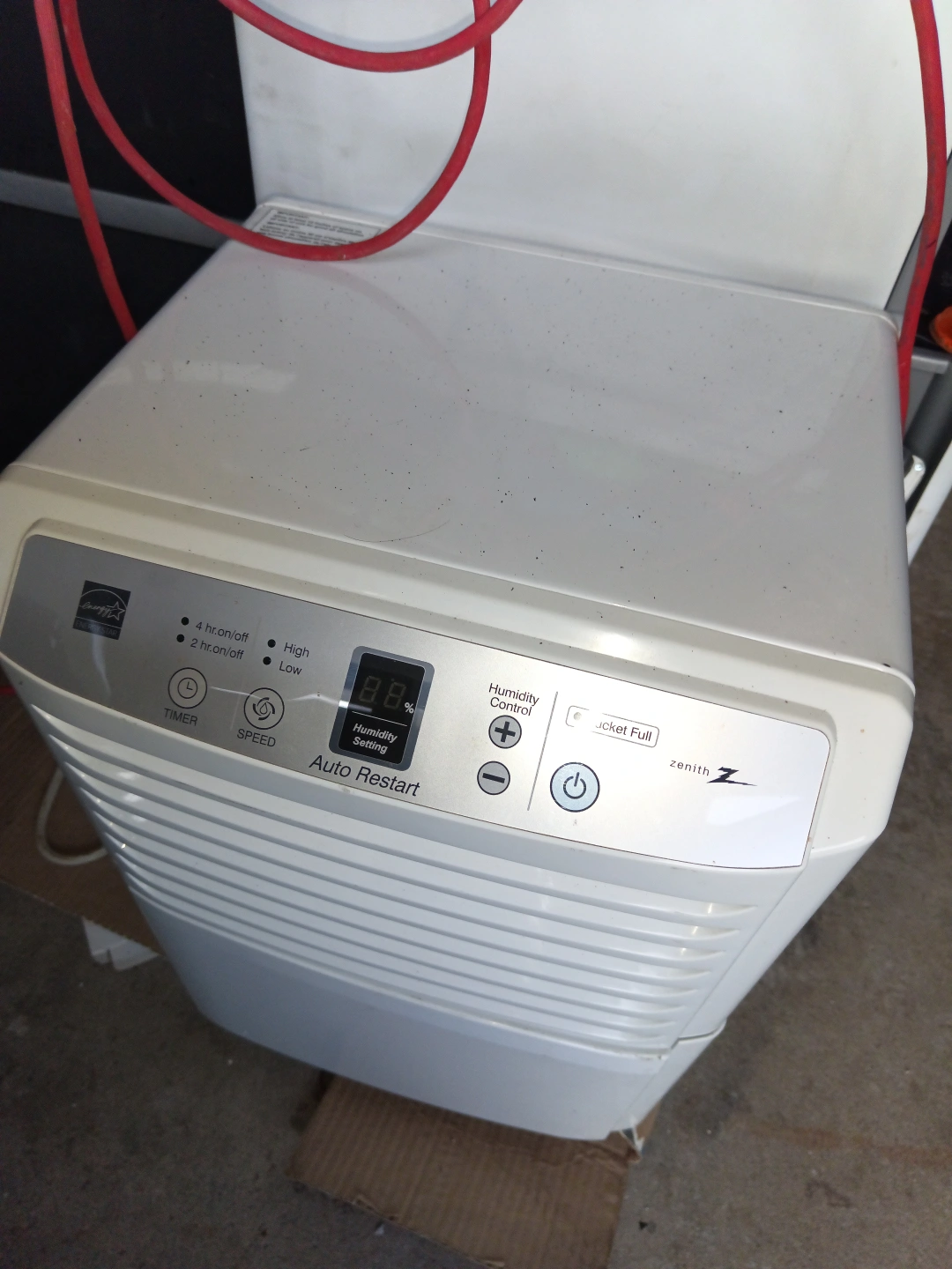 Selling a Kenmore Zenith Z dehumidifier in white. It's in used condition and shows some signs of wear. Features include a timer, adjustable humidity settings, and an auto restart function. Perfect for keeping your space comfortable!