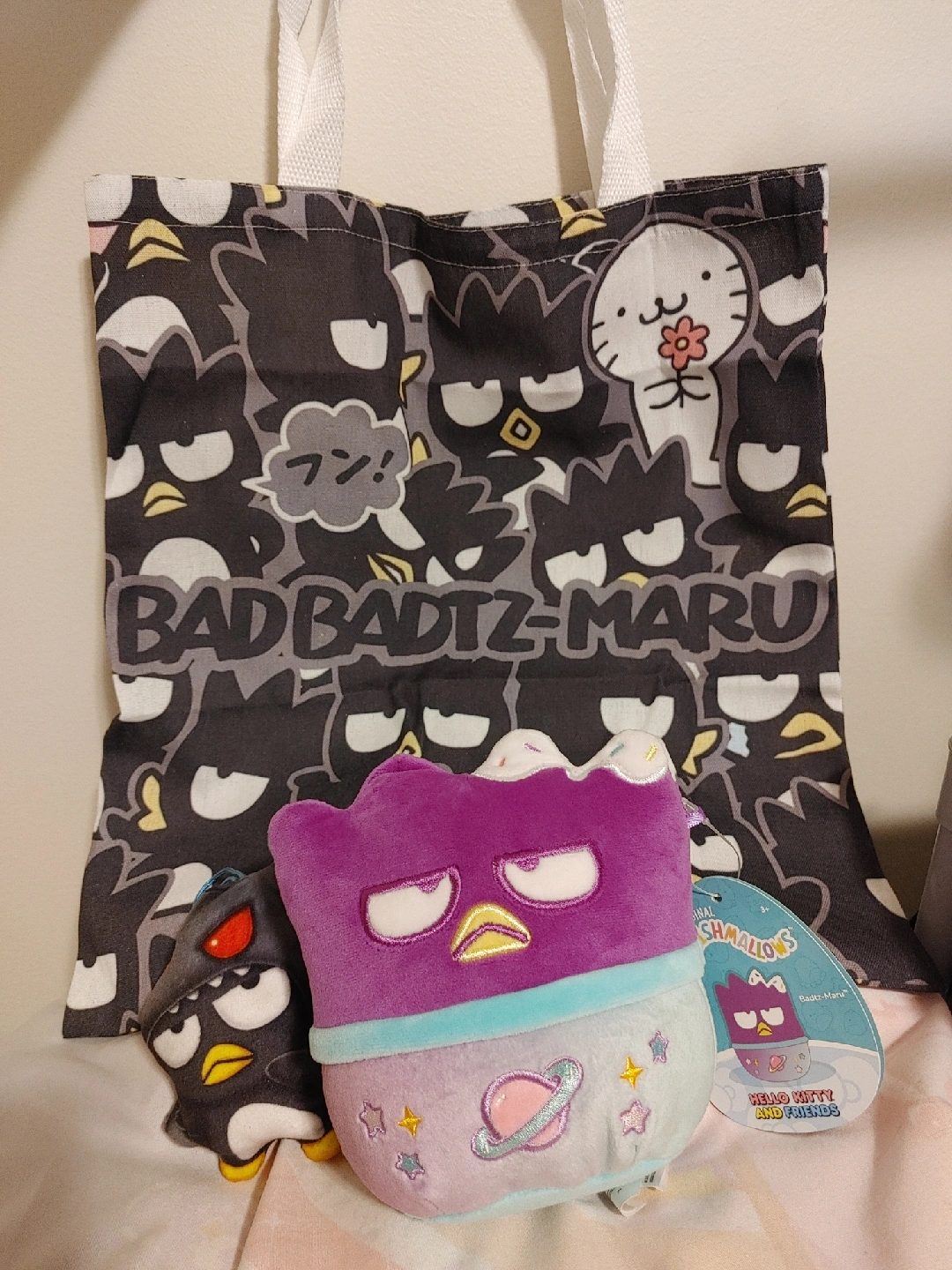 25Mini set includes: (1) Badtz-maru x Squishmallows (1) Canvas Tote Bag (1) Badtz-maru x YuGi-oh collab happy meal toy All brand new, good for gifting and office decoration!