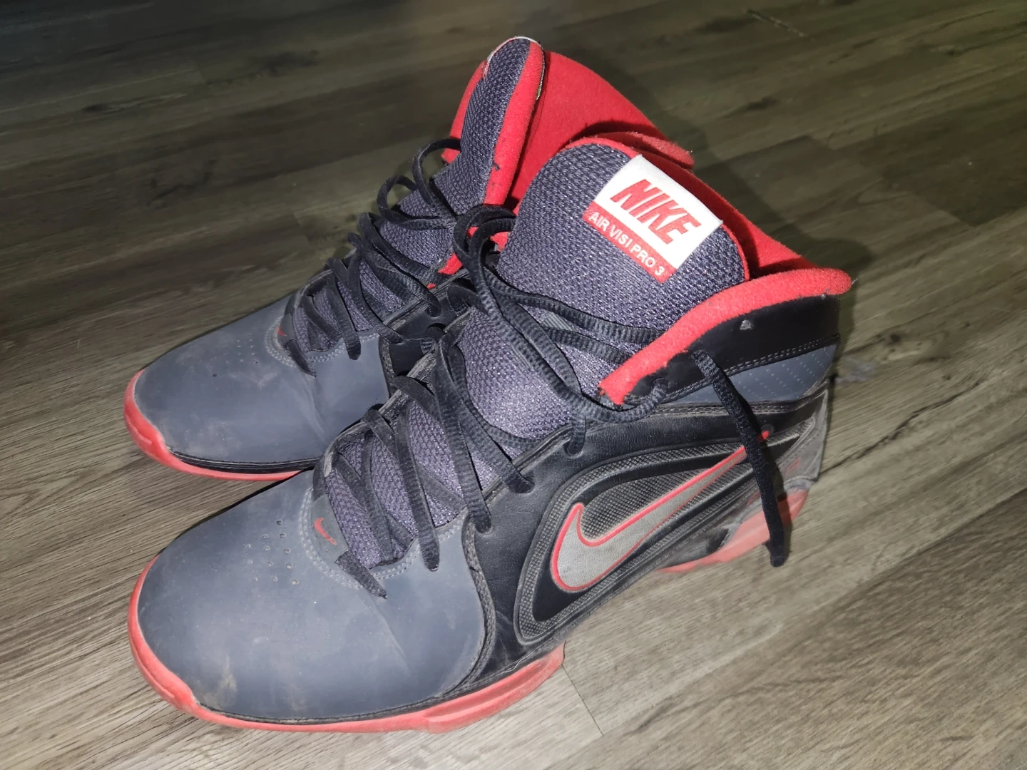 Nike Air Visi Pro 3 basketball shoes in black and red. Men's athletic footwear with laces. These shoes offer ankle support for active play.