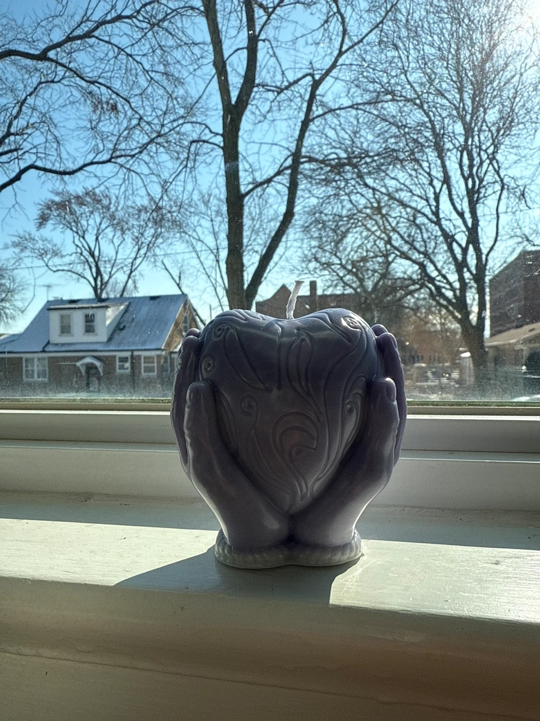 This decorative candle is shaped like a heart held by two hands. It's a lovely lavender color with intricate embossed swirl designs. The candle is made of wax.