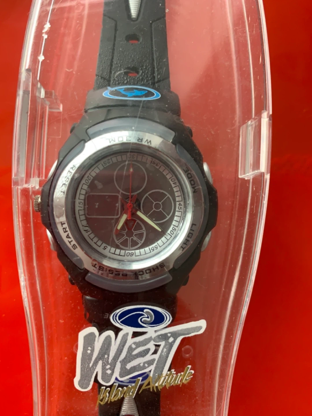 This WET "Island Attitude" watch is in its original case. It features shock resistance and water resistance up to 30m. The band is black and adjustable.