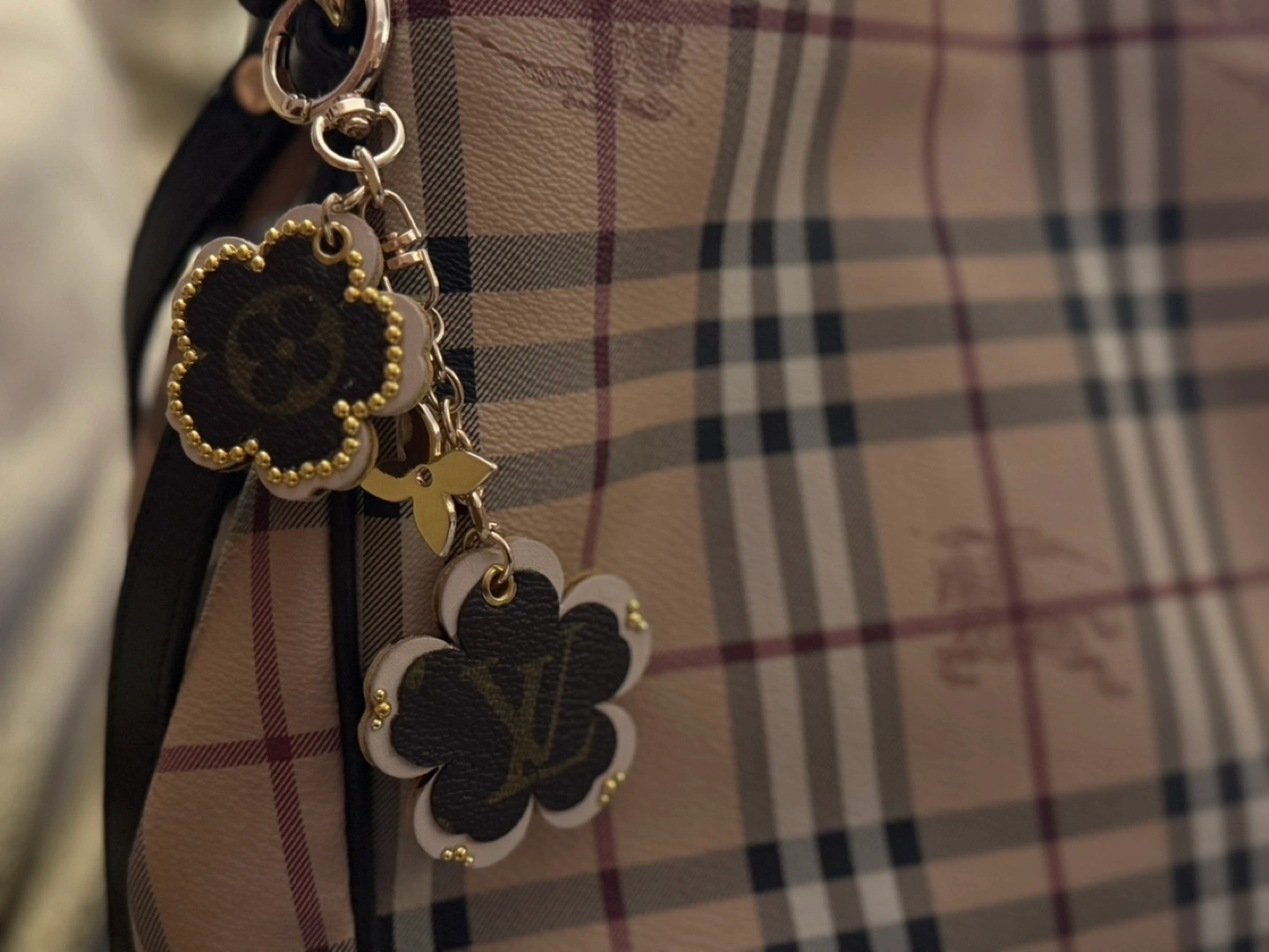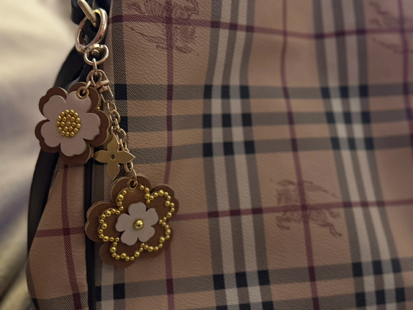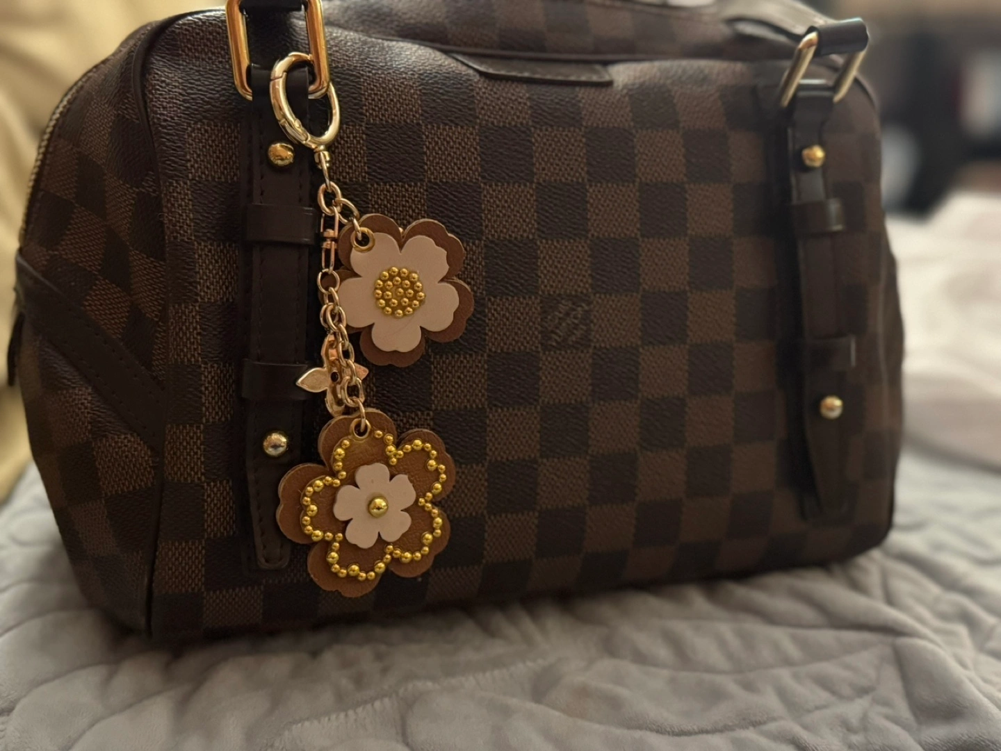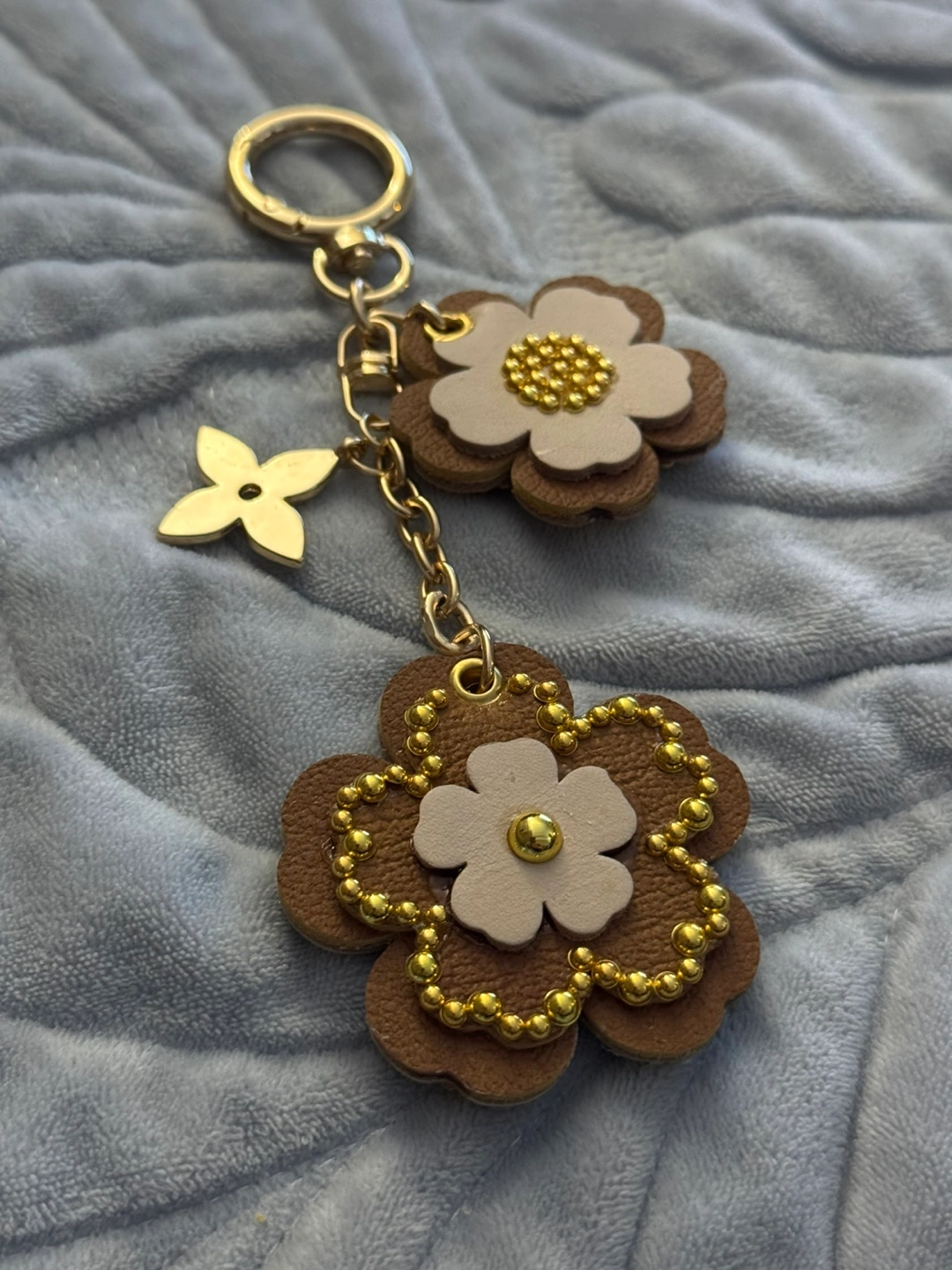 125Unique keychain featuring two flower-shaped charms. Gold-toned accents and chain. Perfect accessory for bags or keys. Stylish and eye-catching. Handmade with authentic louis vuitton Canvas upcycle LV canvas/ repurpose LV canvas. Meet up Kerrisdale area thank you 😊