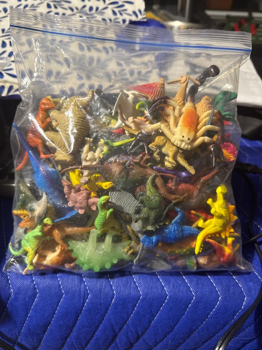Selling a bag full of toy dinosaurs and other animals! Great for kids who love imaginative play or for collectors looking to add to their collection