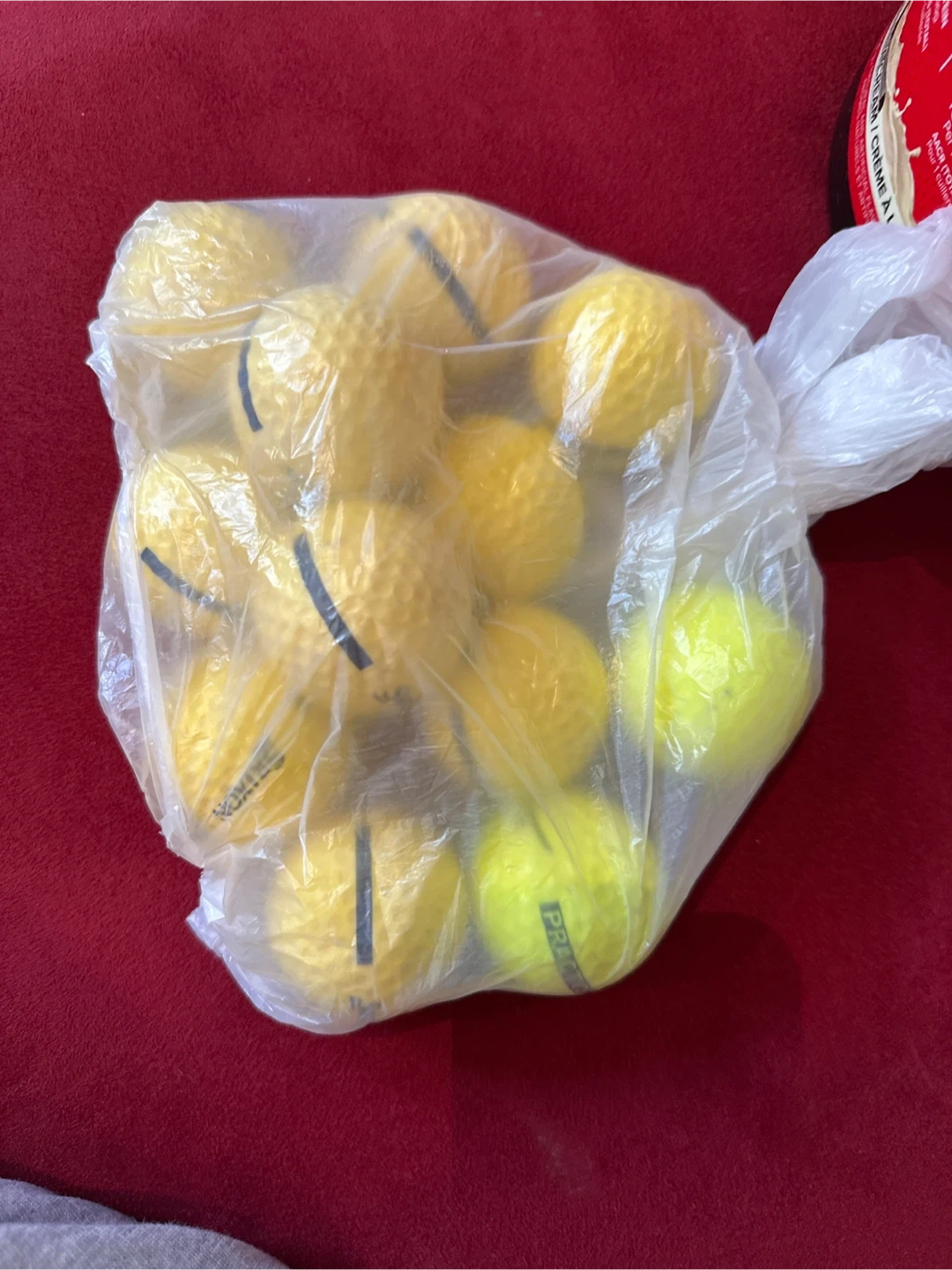34Selling a bag of a dozen practice golf balls. They're yellow and ready for the driving range or some backyard practice. They are refurbished may have slight scratches.