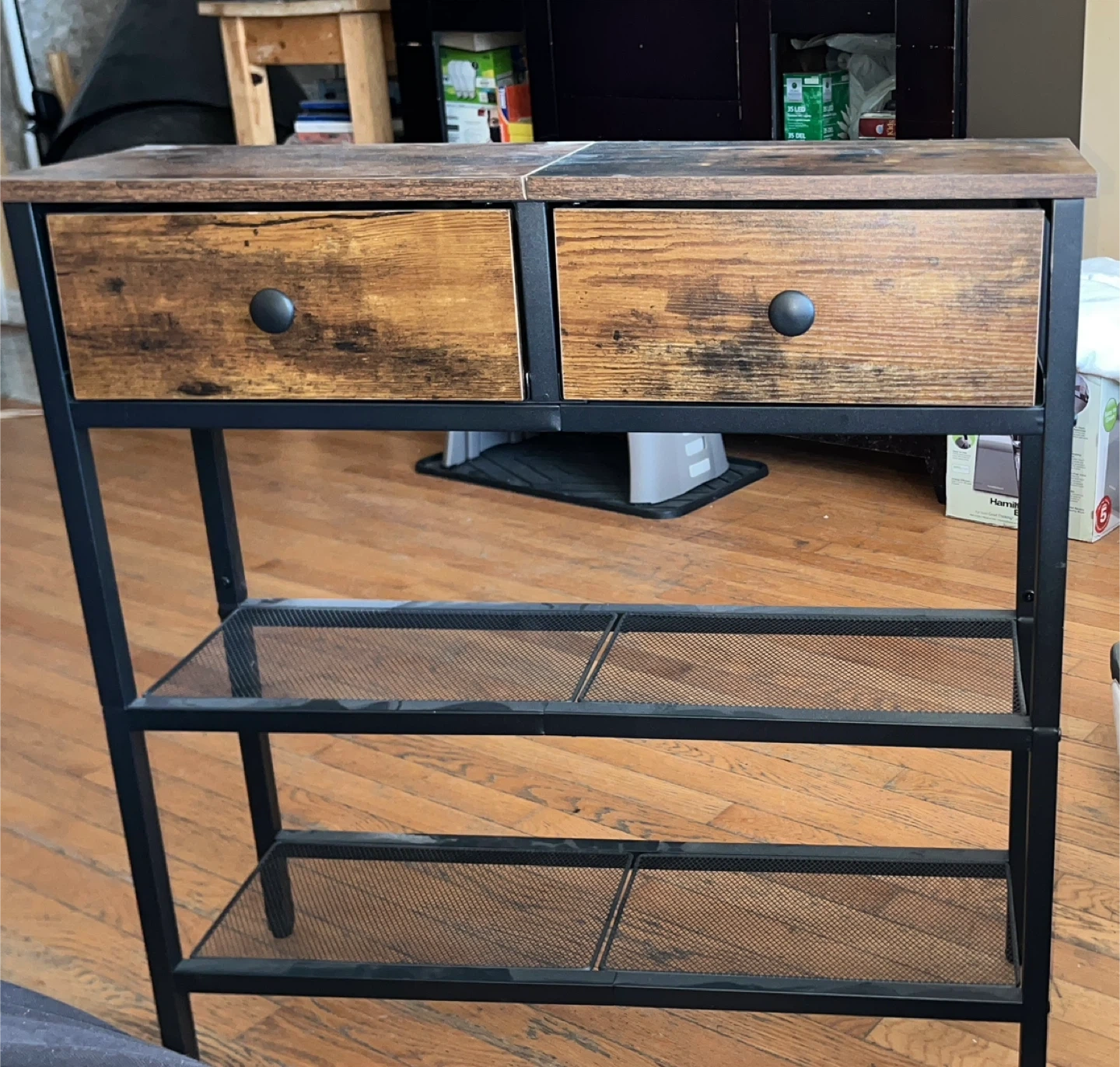 This console table features a rustic wood-grain finish on the top and two drawers. It has a black metal frame with two mesh shelves below for storage. It's a great way to organize entryways or living spaces!