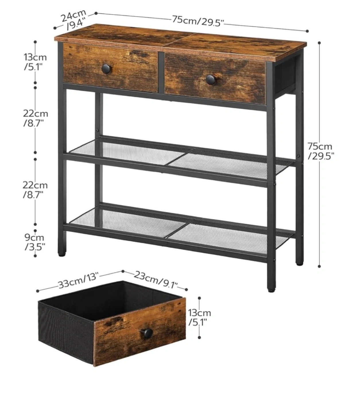 This console table features a rustic wood-grain finish on the top and two drawers. It has a black metal frame with two mesh shelves below for storage. It's a great way to organize entryways or living spaces!