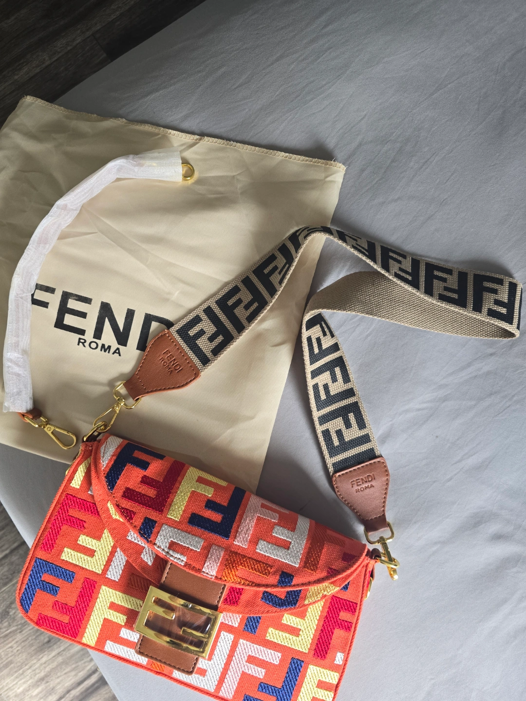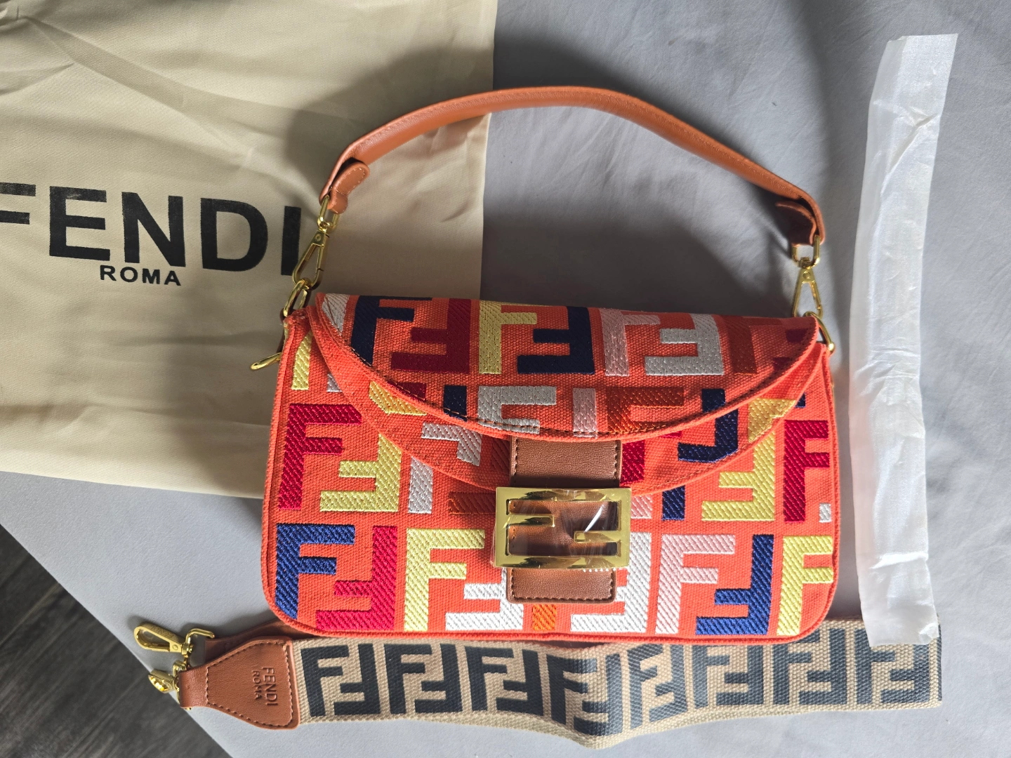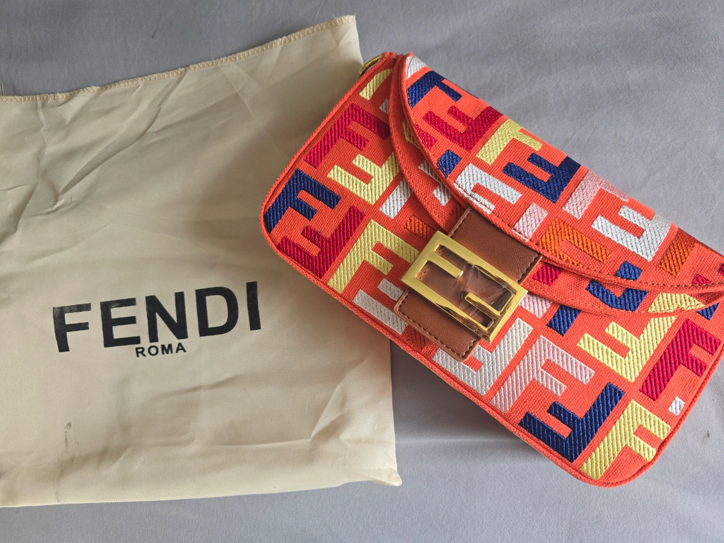 134Brand New Baguette bag, Features a vibrant multicoloured FF motif. Includes a shoulder strap and a small handle strap with the dust bag etc, new n unused in original packaging, refer all pictures, Pick Up Location- Square One Mall