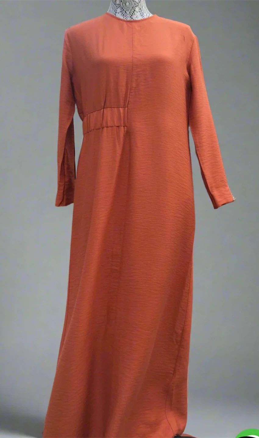 A long-sleeved orange maxi dress featuring elastic on one side It's made from a textured fabric that gives it a subtle sheen. This dress is perfect for a variety of occasions, from casual outings to more dressed-up events.