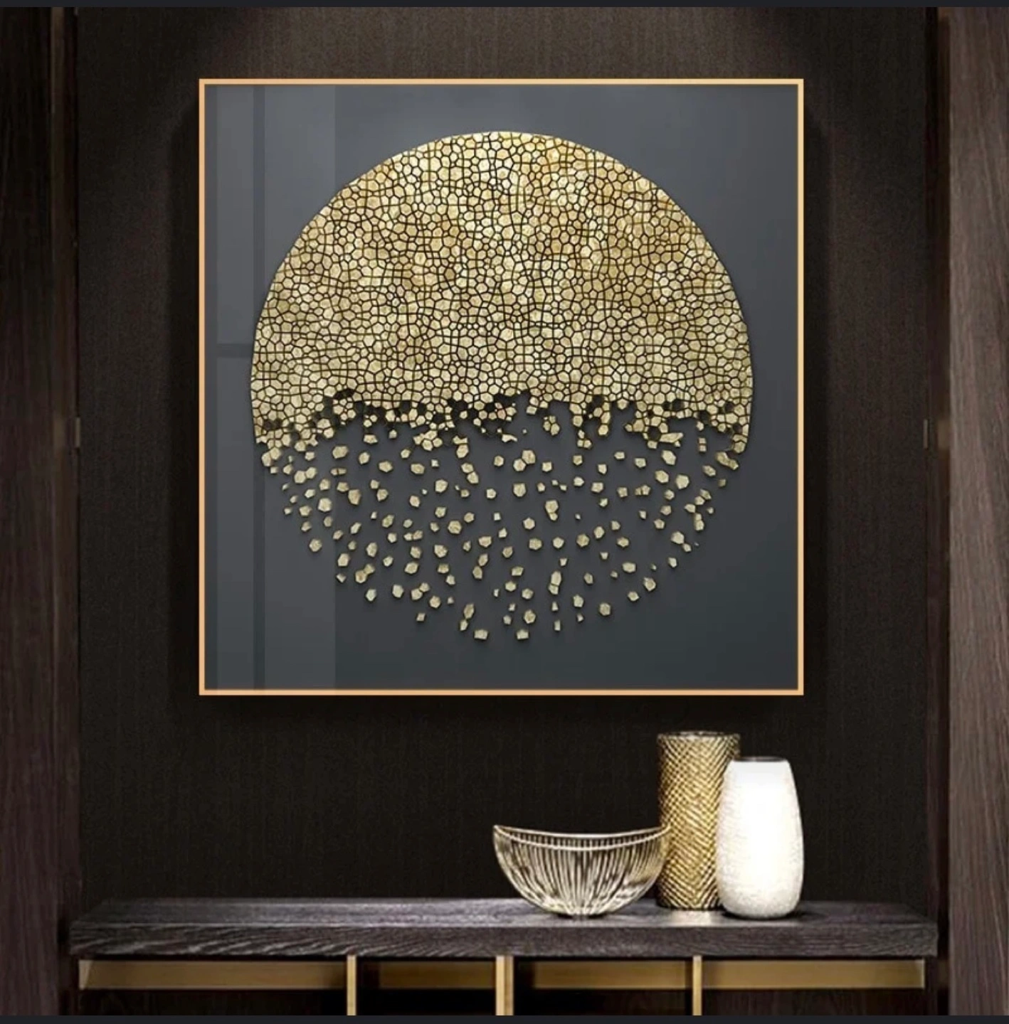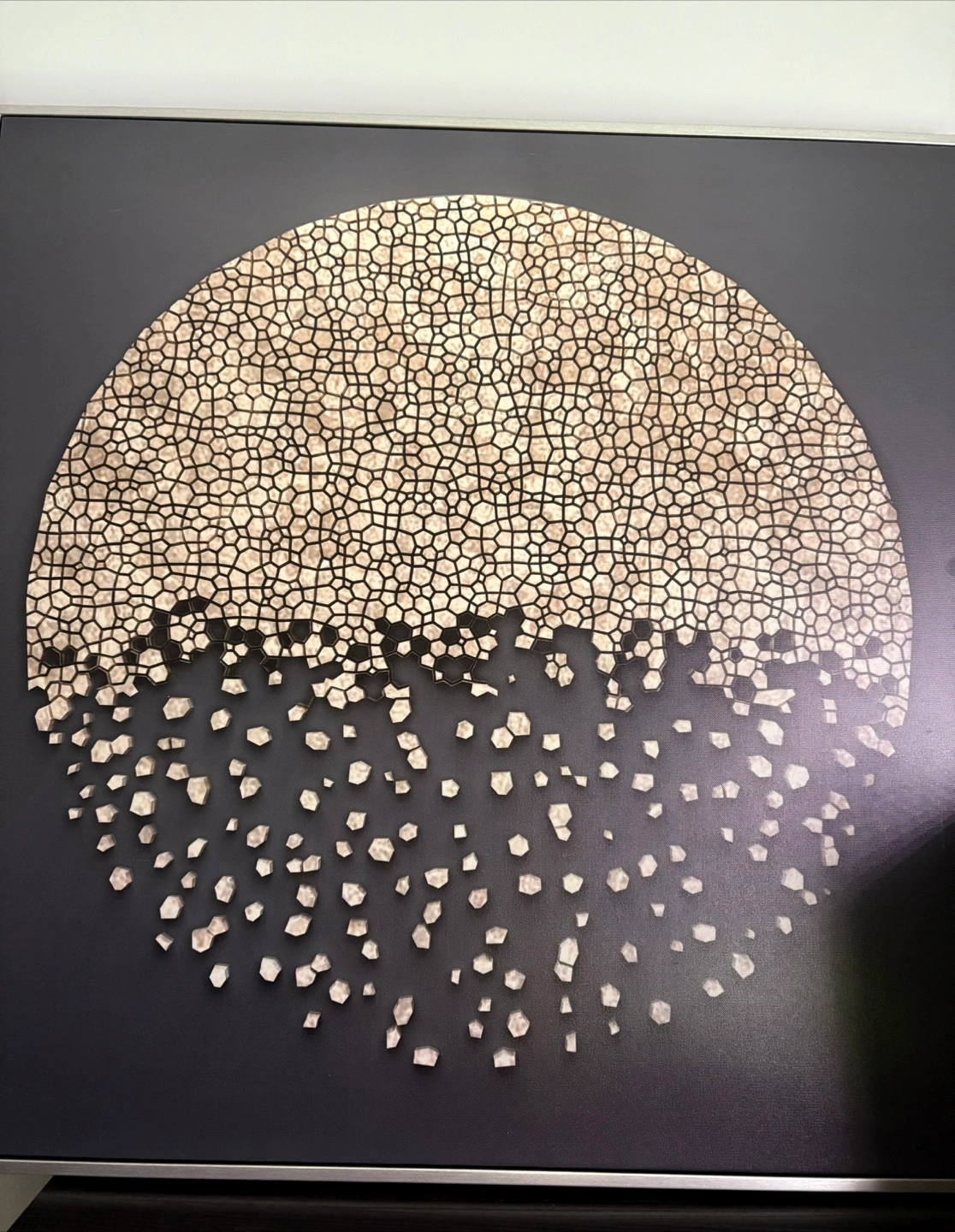 Selling a framed piece of wall art. It features a unique round mosaic design in neutral tones on a dark background. It's in great condition and ready to add a touch of modern elegance to your space!