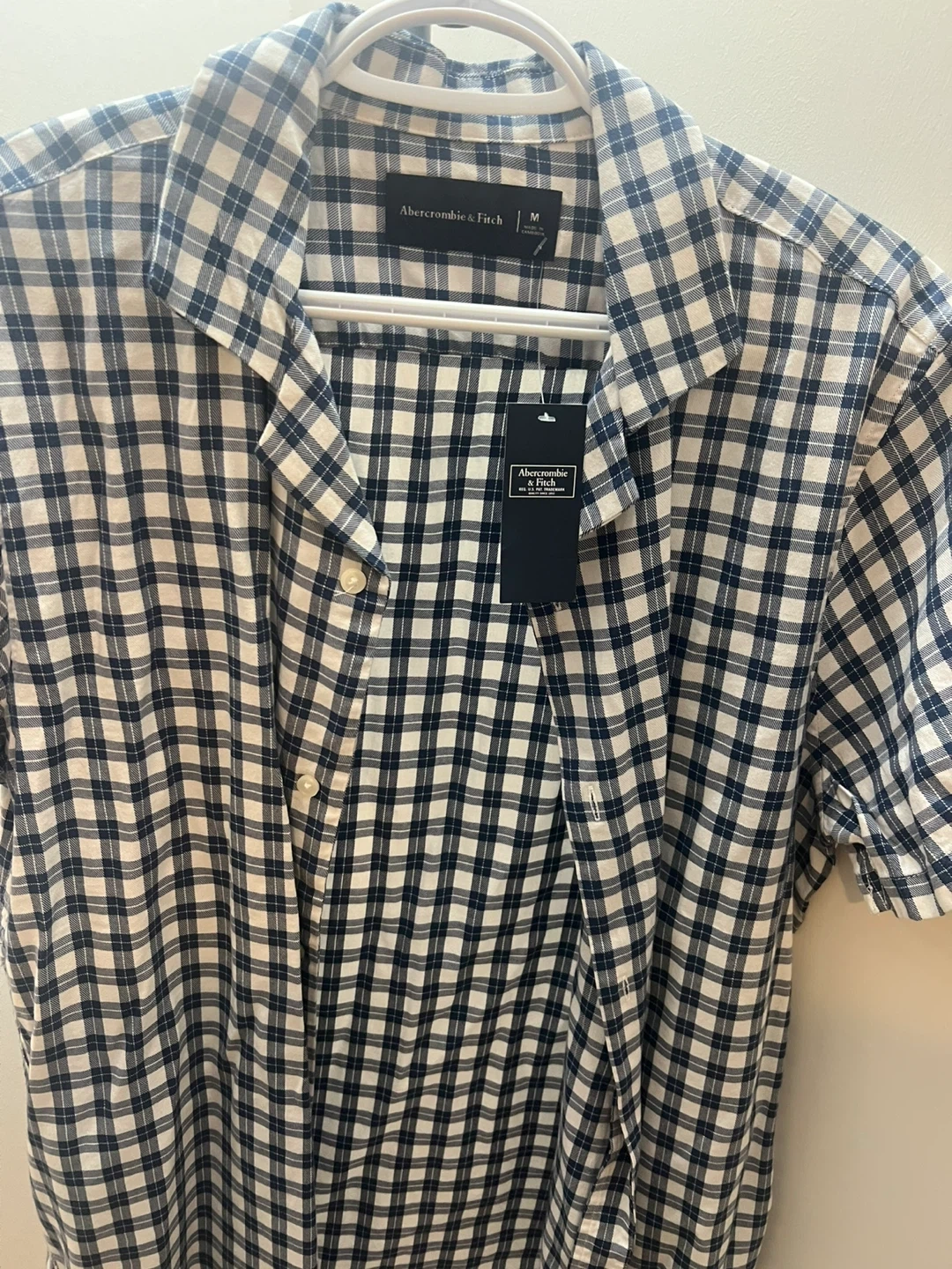 This is a men's short sleeve button-up shirt from Abercrombie & Fitch. It features a classic blue and white gingham pattern. The shirt is size medium and made of a breathable fabric. Perfect for casual wear during warmer months!