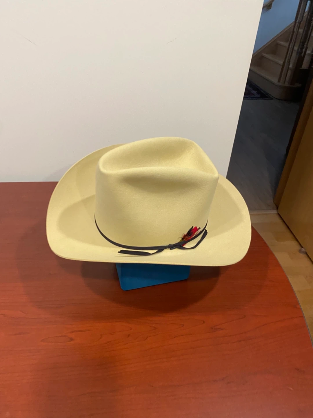 60Selling a cowboy hat only worn once. It features a classic design with a curved brim and a decorative band. Perfect for adding a touch of western style to your wardrobe. 5x Beaver long oval size 7 5/8. Made in Texas