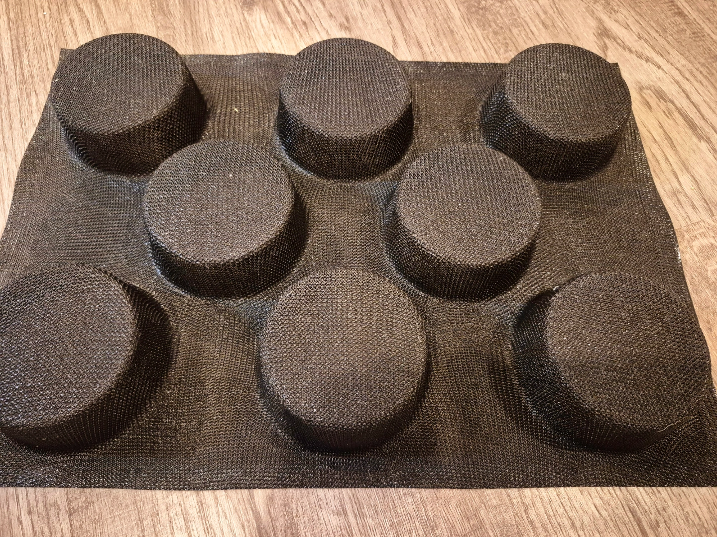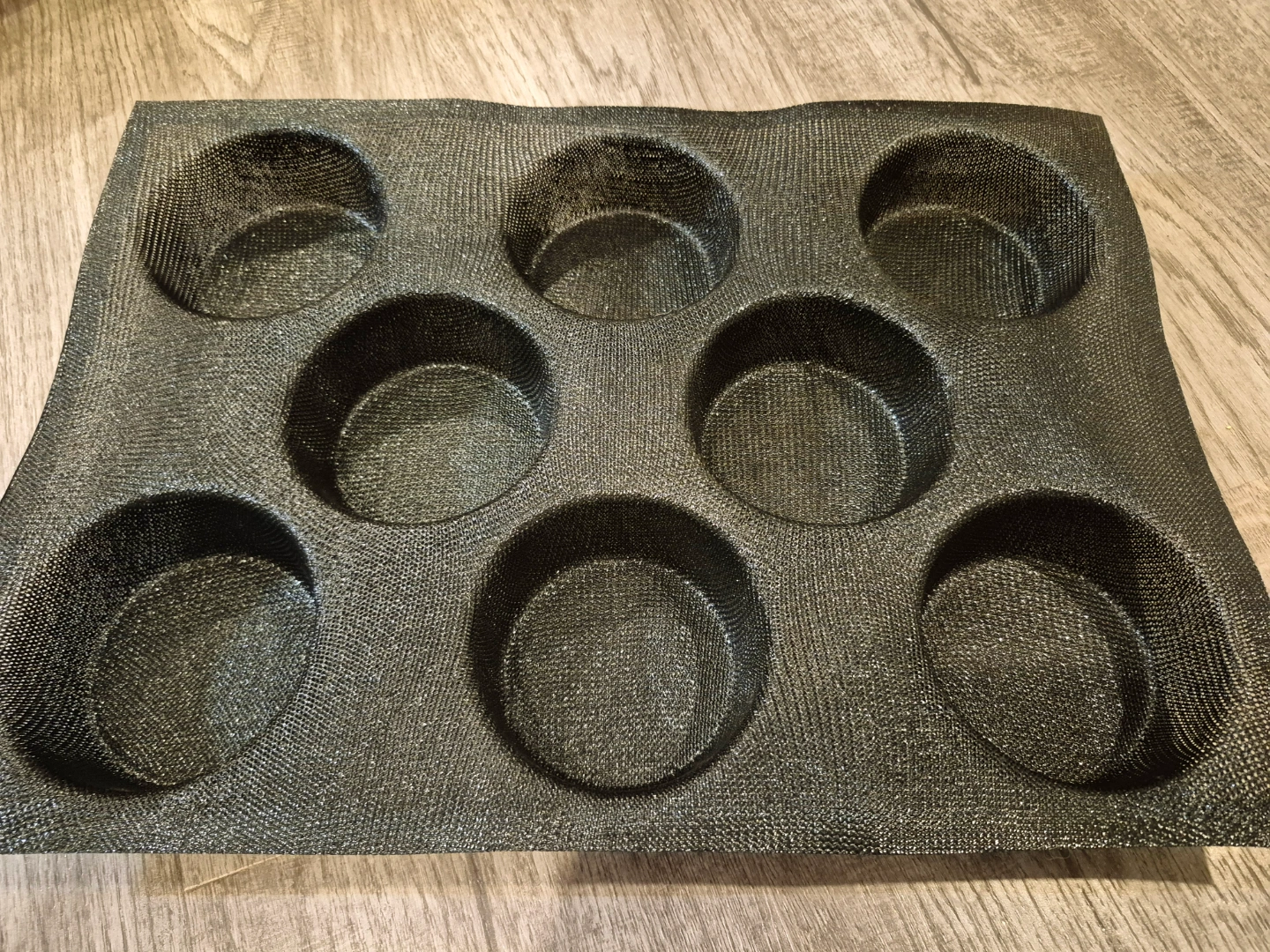 Eight-cavity baking mat. Great for making round breads or other baked goods. Non-stick surface. Flexible and easy to clean.