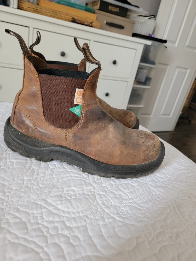 These Blundstone Steel toe Safety work boots are made of brown leather. They're the classic Chelsea boot style. Great for tough jobs or everyday wear!