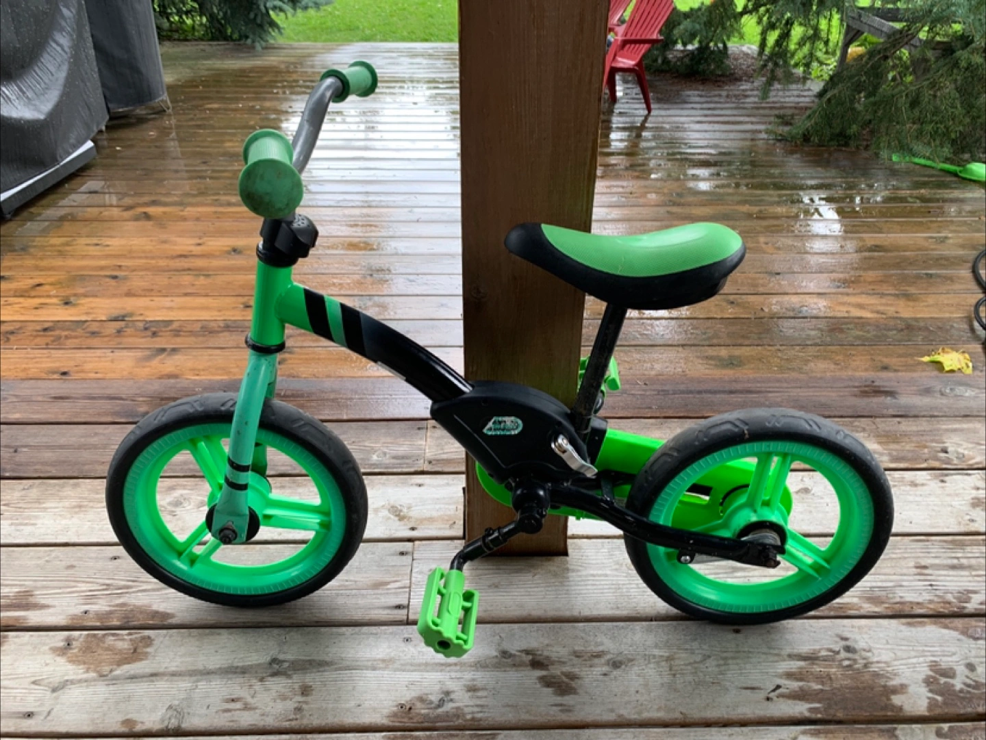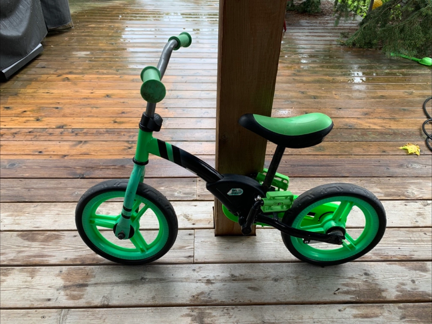 Selling a balance bike in green and black! It's perfect for kids learning to balance before transitioning to a pedal bike. It has a comfortable seat and sturdy frame. Great for outdoor fun!