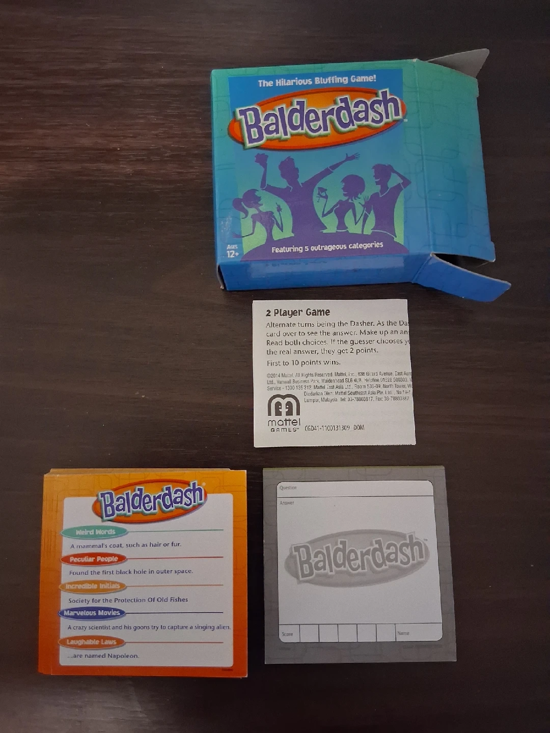 441Selling a new Balderdash board game, the box is just in rough shape but cards have never been used ! It's the hilarious bluffing game featuring 5 outrageous categories. This game is for ages 12+ and is a 2 player game