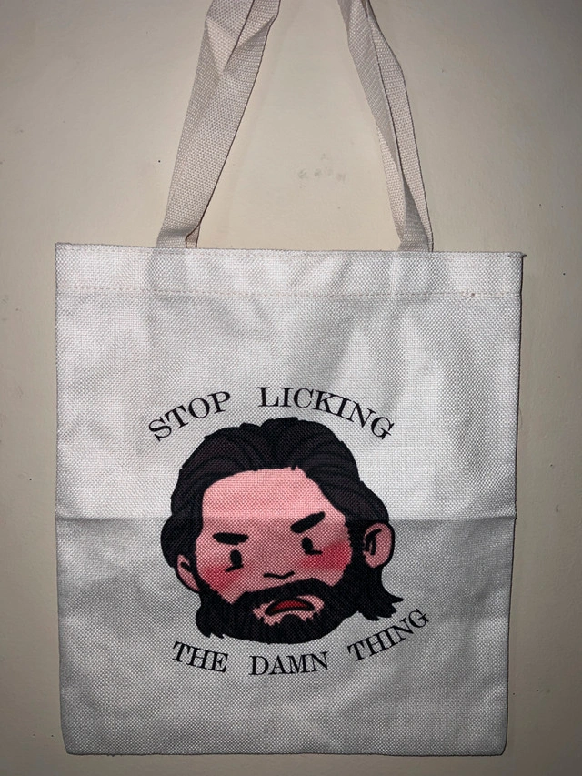 15Baldur's Gate 3 "Stop Licking The Damn Thing" Canvas Tote Bag/Shoulder Bag. Brand new in original packaging. Never used. Reference from one of the most popular video games, Baldur's Gate. Shoulder Bag, large enough to carry mid-size laptops, books, and accessories. Also makes a great fashion statement. Wrinkles can be taken out by carefully ironing canvas material at low to medium heat, avoiding direct contact with the artwork. Dimensions: Height: 34cm Length: 28cm
