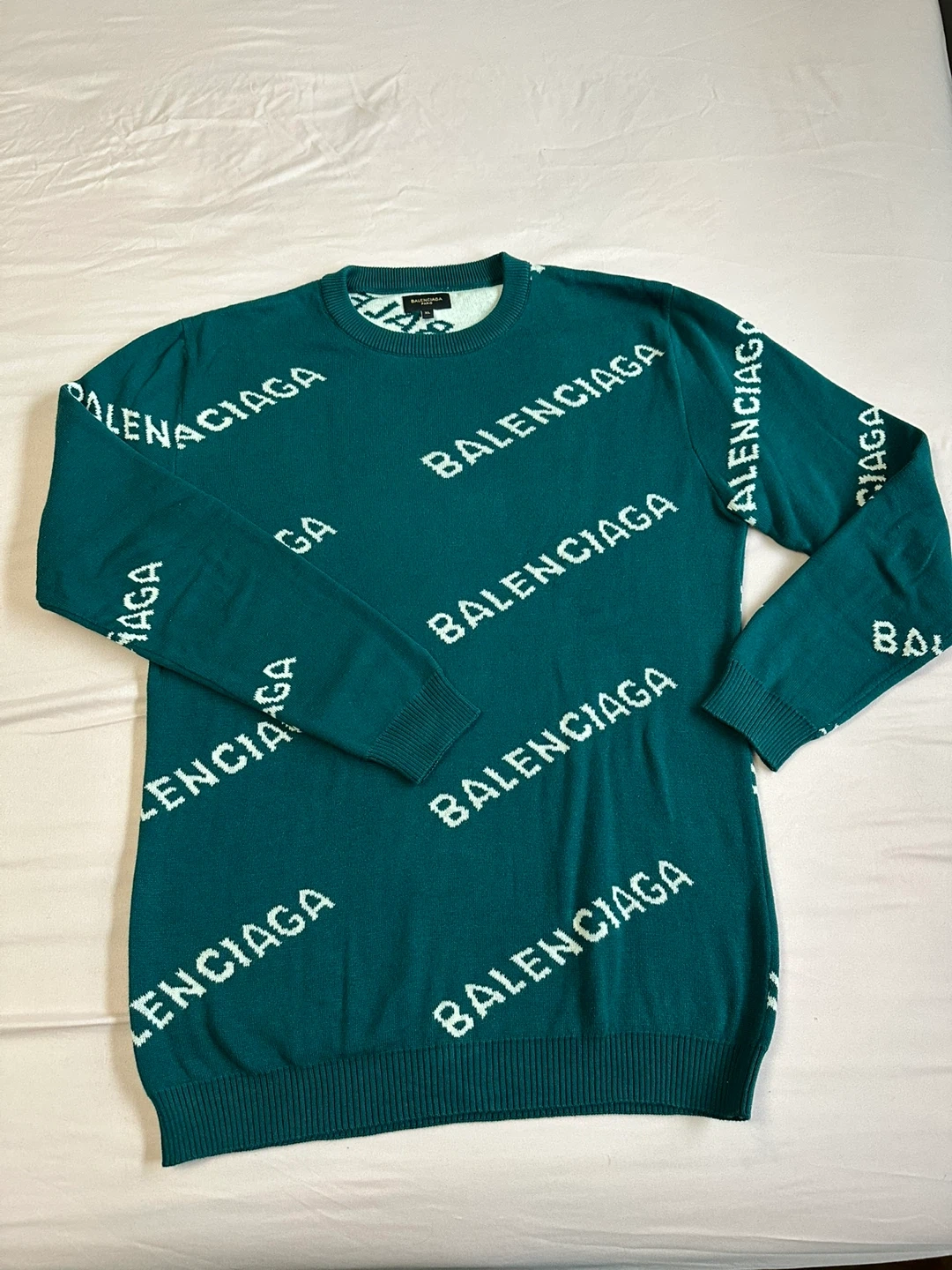 Got this as a gift from a friend, but it’s not really my style so passing it on to someone who’ll rock it better! This Balenciaga crewneck sweater features the iconic all-over logo print in a rich teal green color. The fabric is soft, premium-quality knit that feels super comfortable yet looks effortlessly stylish. Perfect for layering or making a bold statement on its own. ✅ Cozy, soft-touch knit ✅ Unisex oversized fit ✅ Excellent condition ✨ A stylish piece that blends luxury and streetwear vibes perfectly.