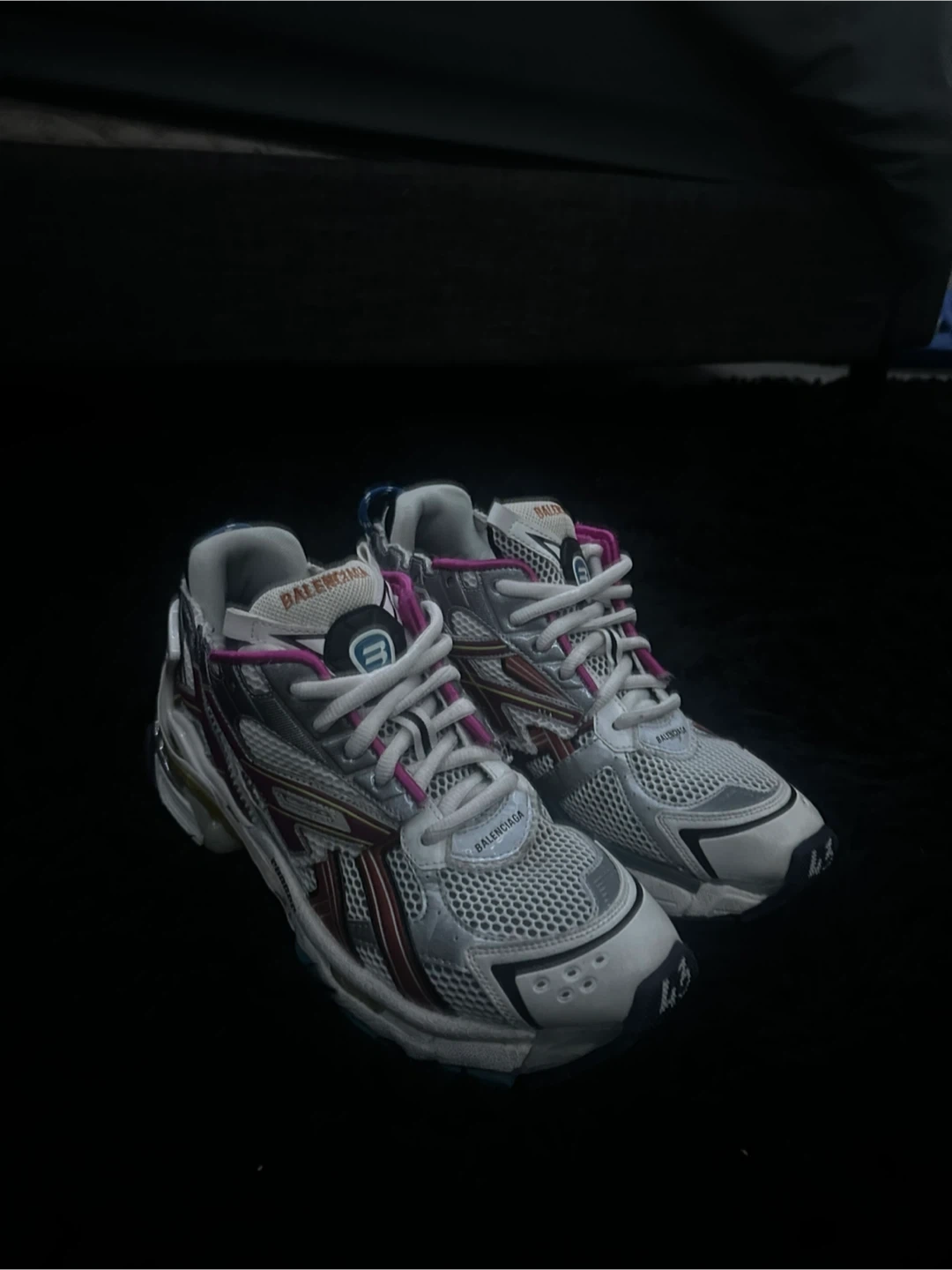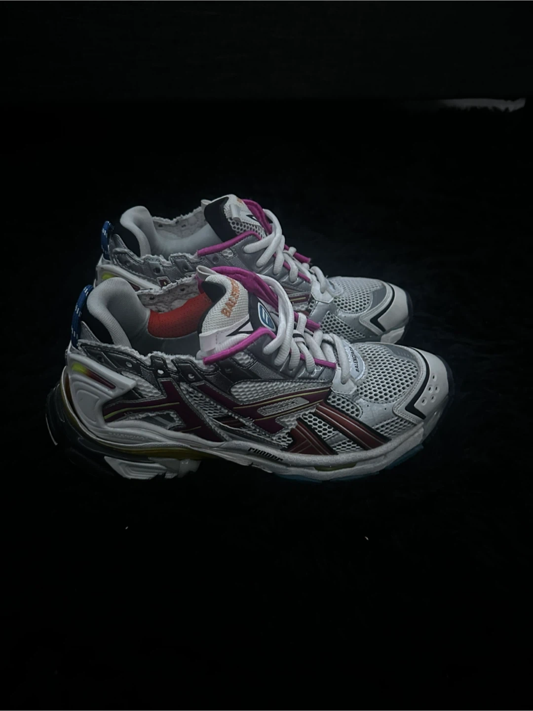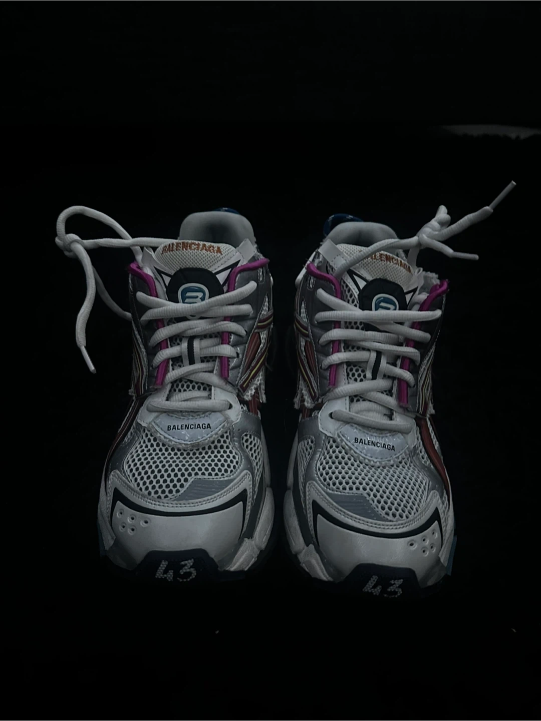 Selling a pair of Balenciaga Runner sneakers in size 43. They have a unique and stylish design with a mix of silver, white, and burgundy colours. They are in good condition and ready for a new home!