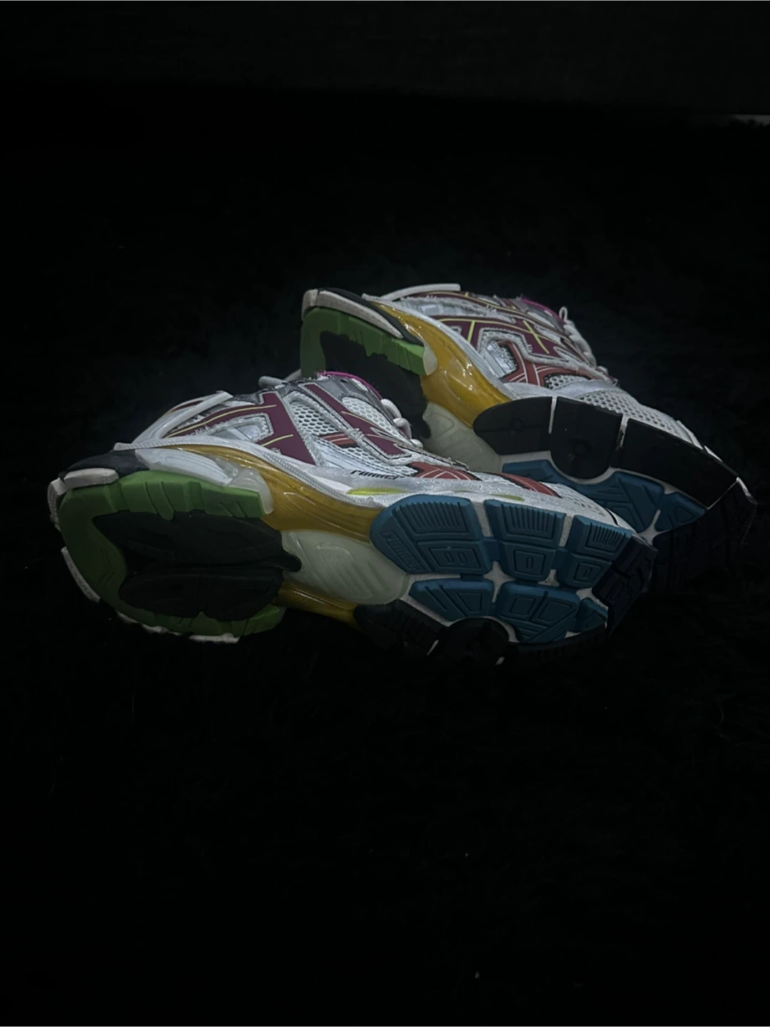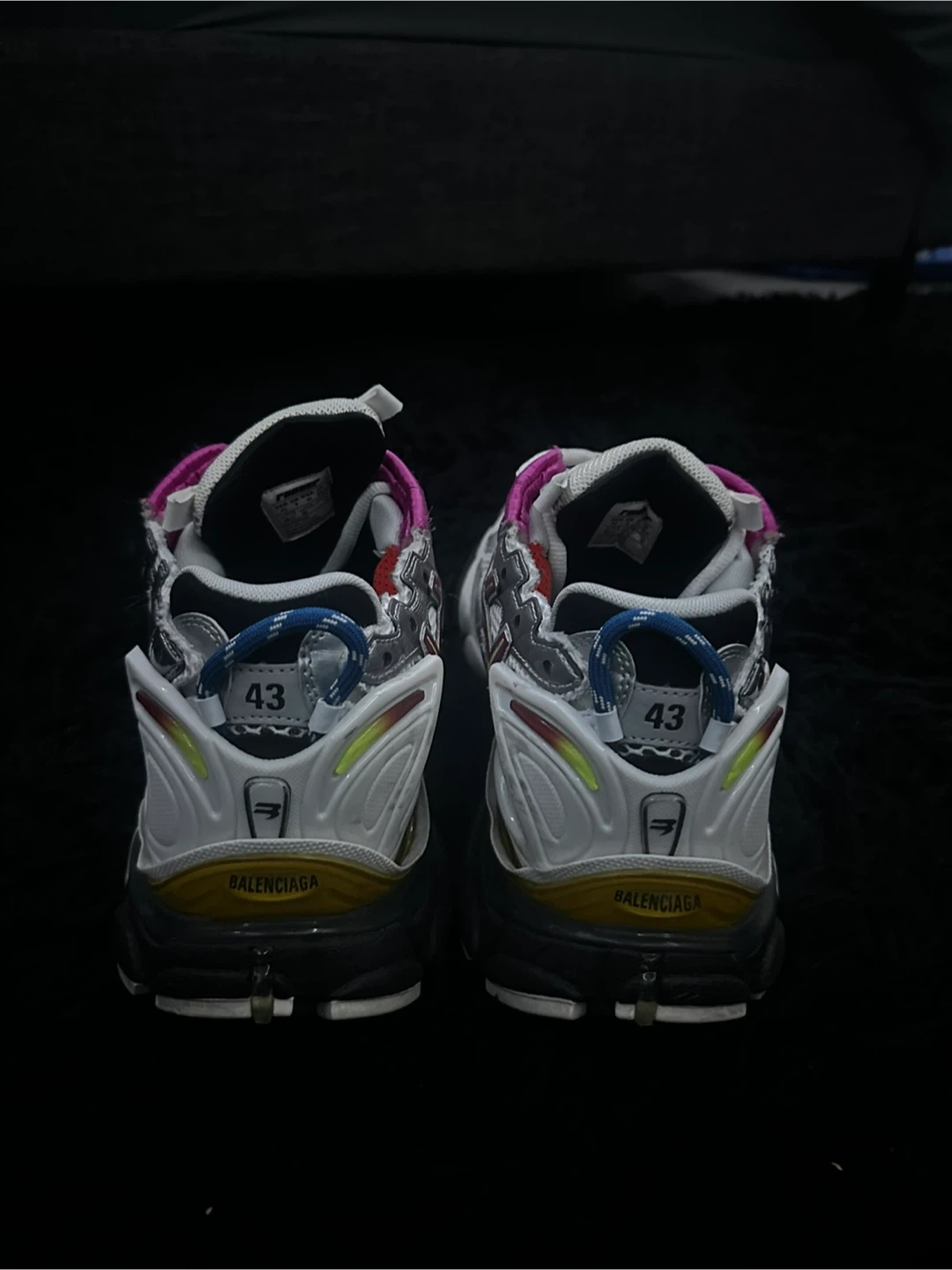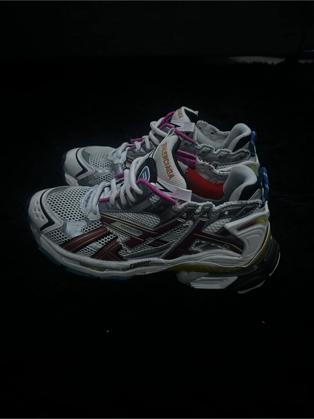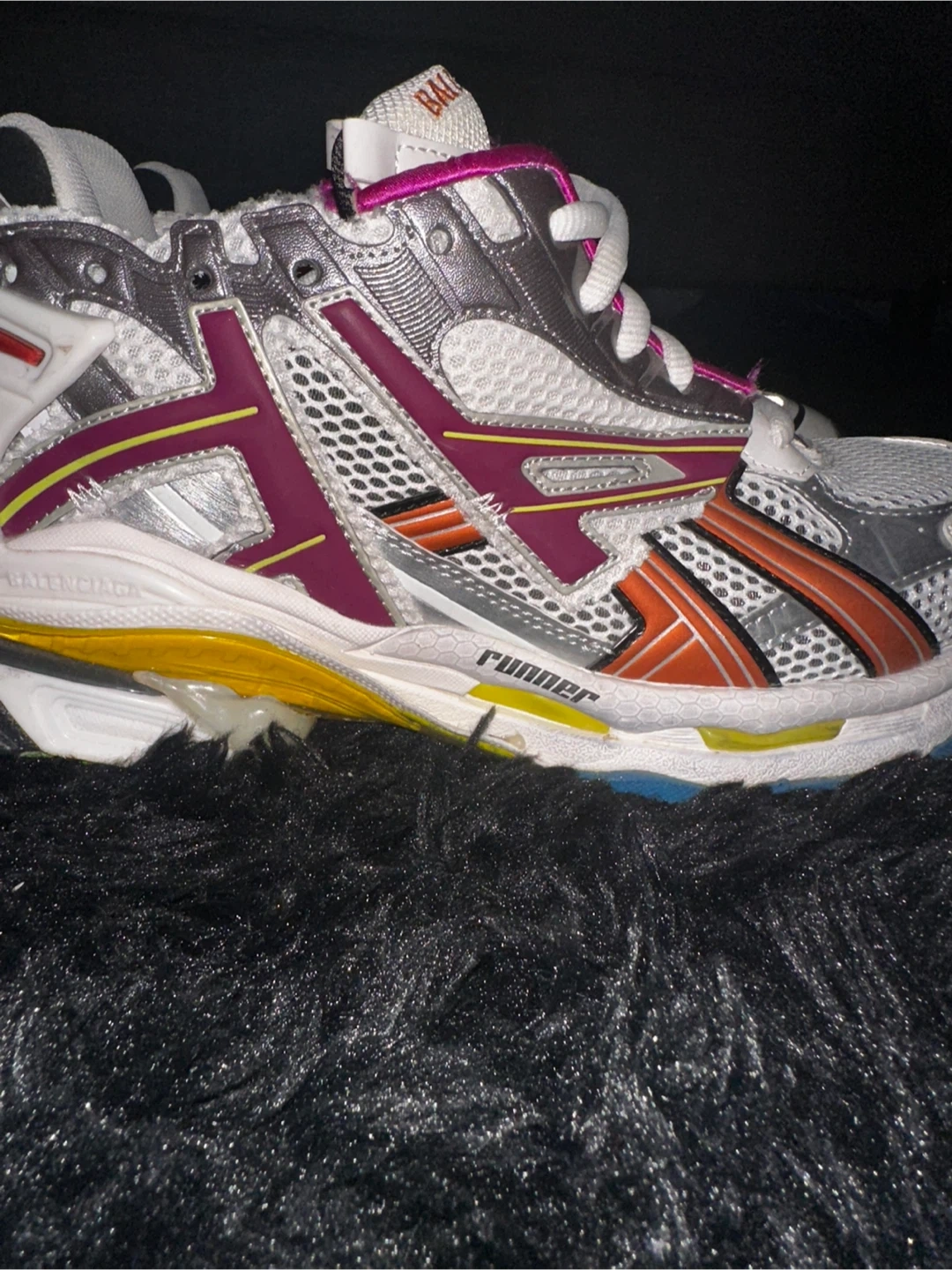 Selling a pair of Balenciaga Runner sneakers in size 43. They have a unique and stylish design with a mix of silver, white, and burgundy colours. They are in good condition and ready for a new home!