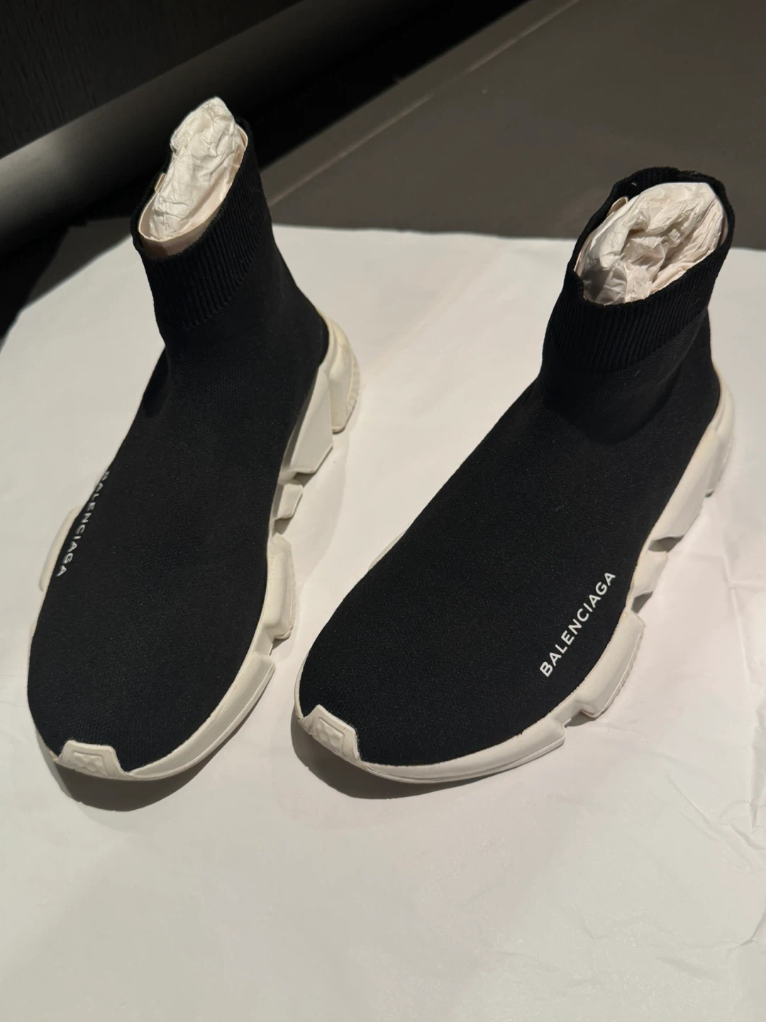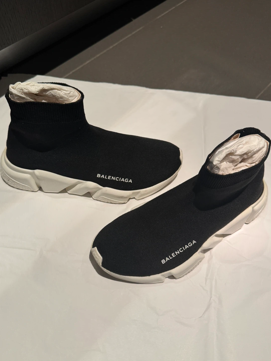 55This pair of Balenciaga Speed Trainer sock sneakers in size 38 is in excellent condition. The black knit upper is smooth, clean, and free from snags, scratches, or discoloration. The white rubber sole is also very clean, with only a small, faint mark on the heel area. Because the size was slightly too big for me, I only wore them twice, and both times with insoles. As a result, the interior remains in perfect condition—no stains, no discoloration, and no odor. They’ve been stored carefully in a glass display cabinet, so overall they’re very well maintained. I’m only selling them because they don’t fit me properly. Comes with the original dust bag.