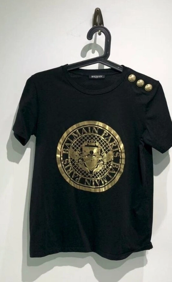 Selling authentic Balmain black t-shirt. It features a striking gold logo design on the front and unique button detailing on the shoulder. This shirt is sure to add a touch of luxury to your wardrobe!