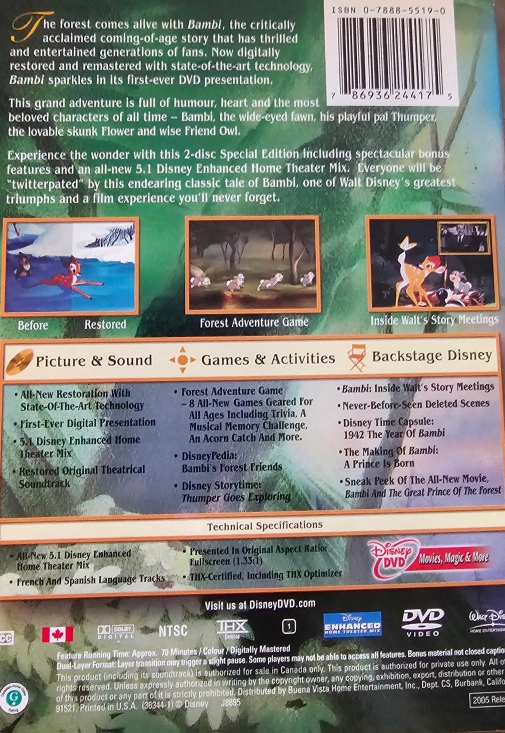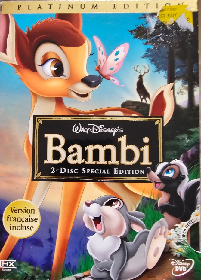 The cover features Bambi and his friends. Platinum edition. It includes a French version. The case is in good shape, as shown. Watching this film will help you unwind after a long day. Price is firm!!!