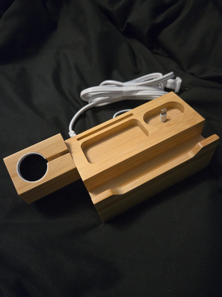 78Selling a bamboo charging station, perfect for organizing your Apple devices! It has a spot for your phone, Apple Watch, and more. Comes with the charging cable as well