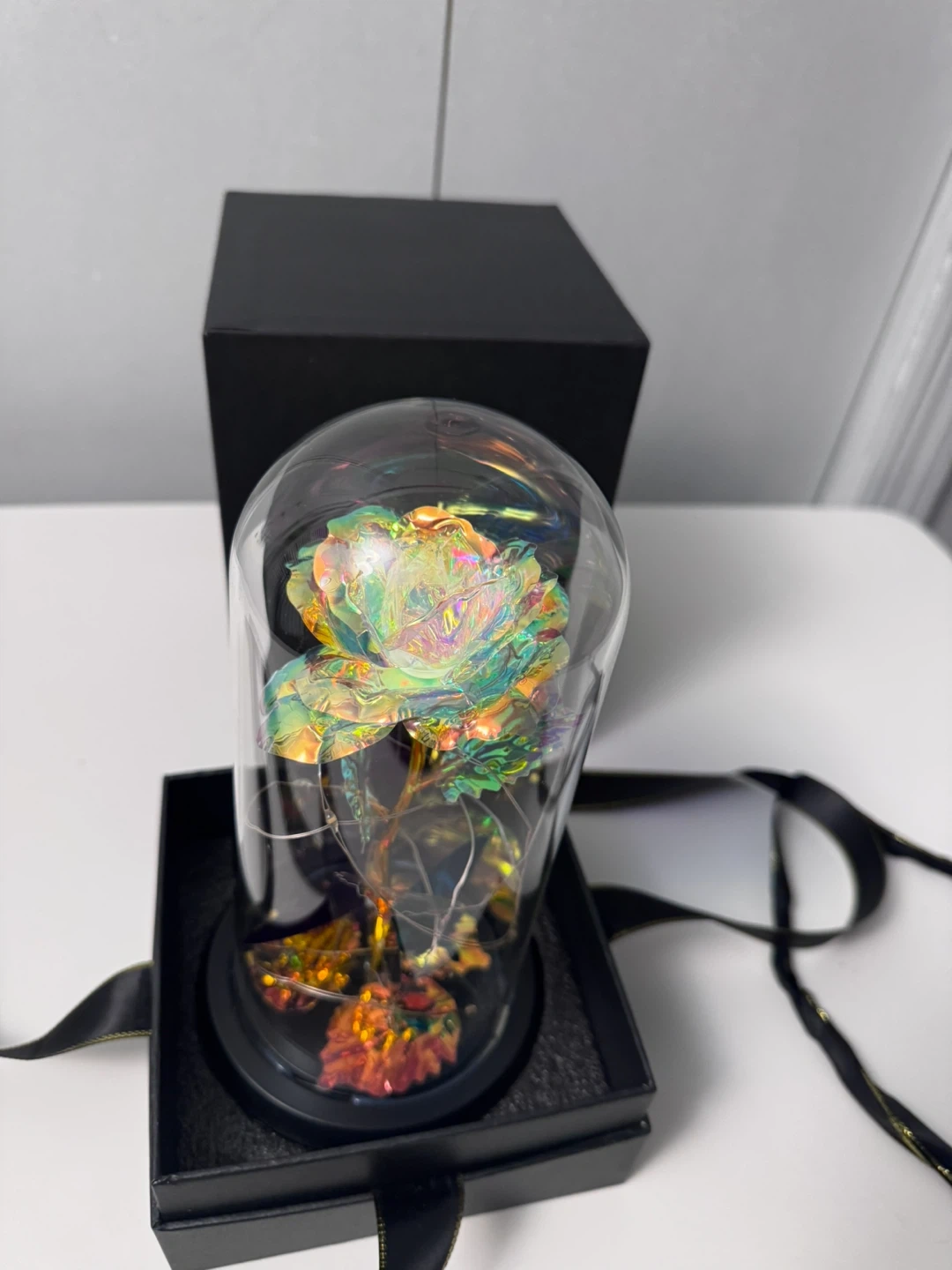 This decorative dome features a galaxy-patterned rose with embedded LED string lights. It comes in a black gift box with a ribbon closure. Perfect for adding a touch of sparkle to any room! Great for valentines gifts or birthday, mother’s gift. Batteries are not included in this.