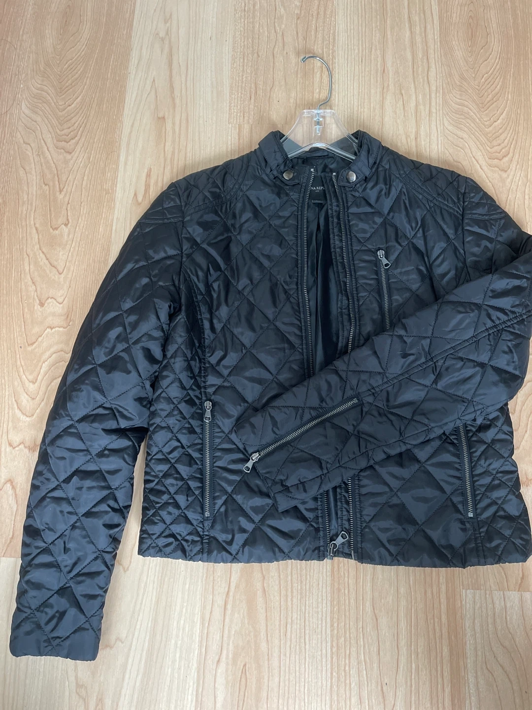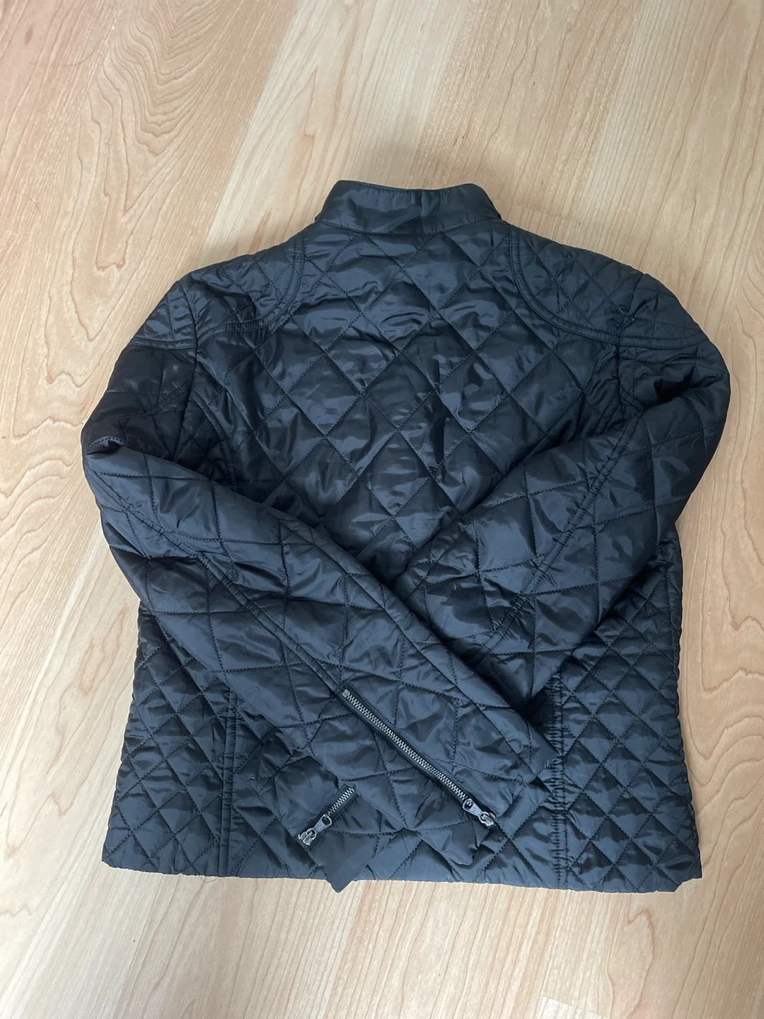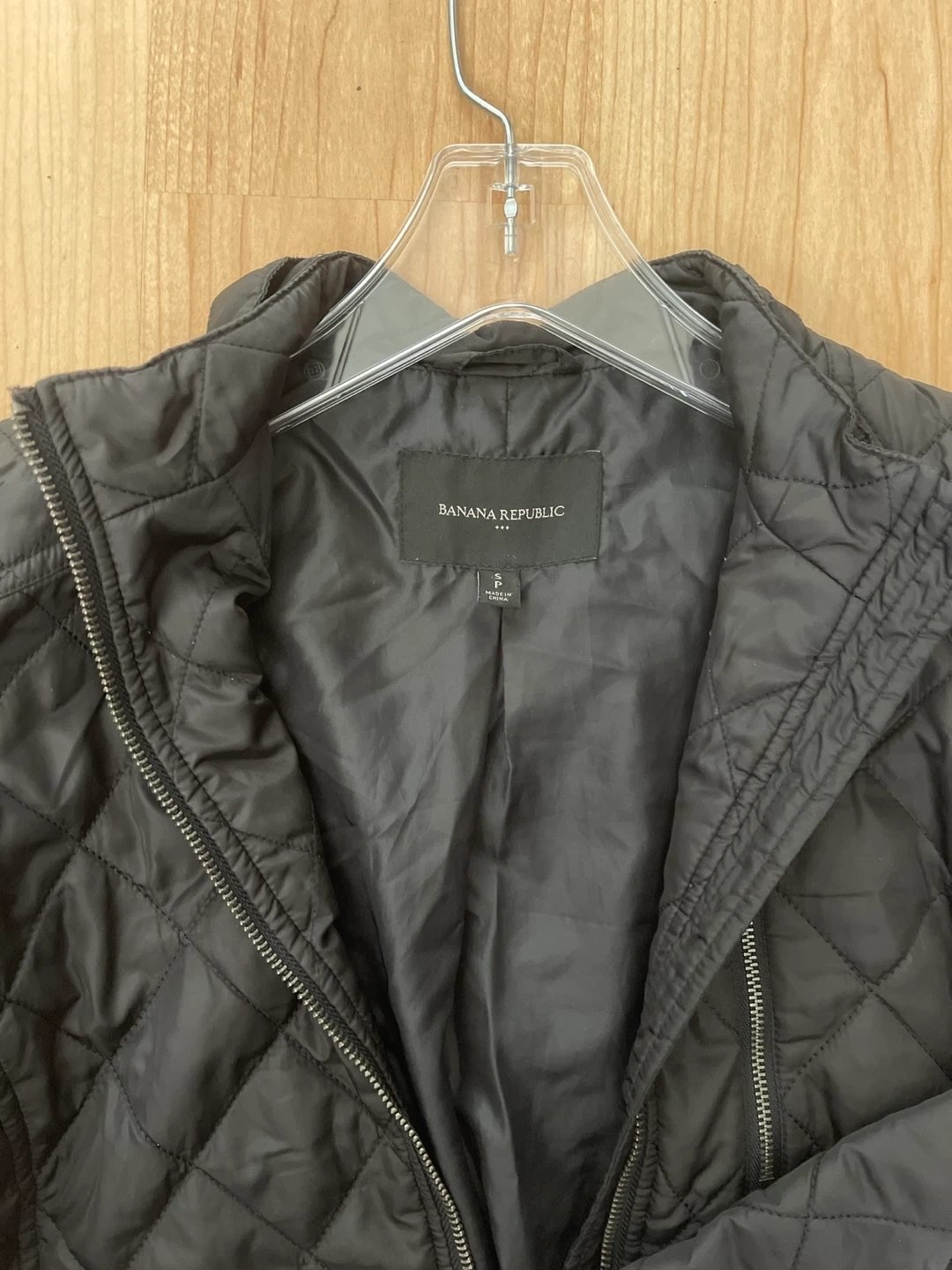 10Selling a gently used Banana Republic quilted jacket in size S. It's black and features a stylish quilted design. Perfect for layering!