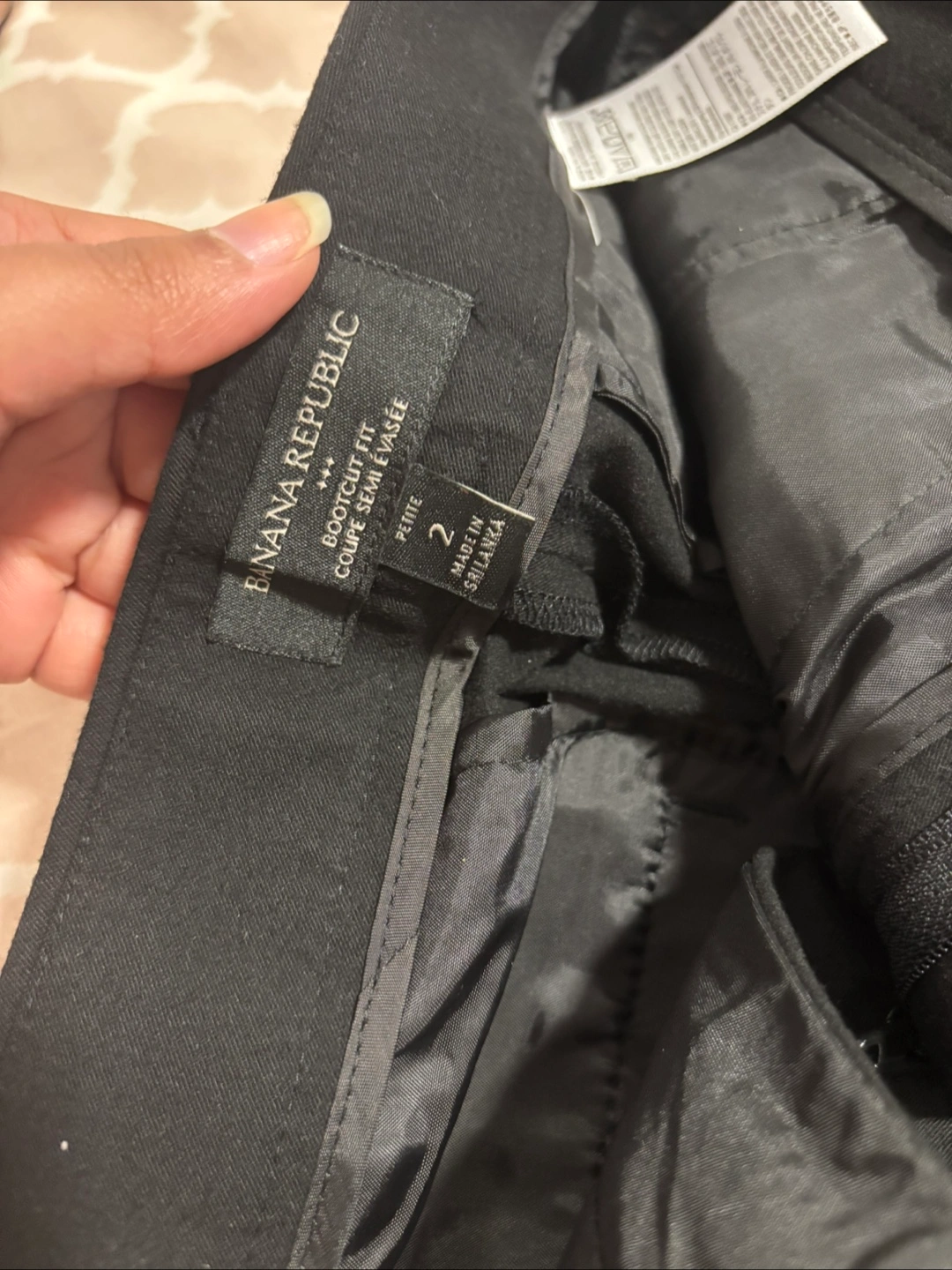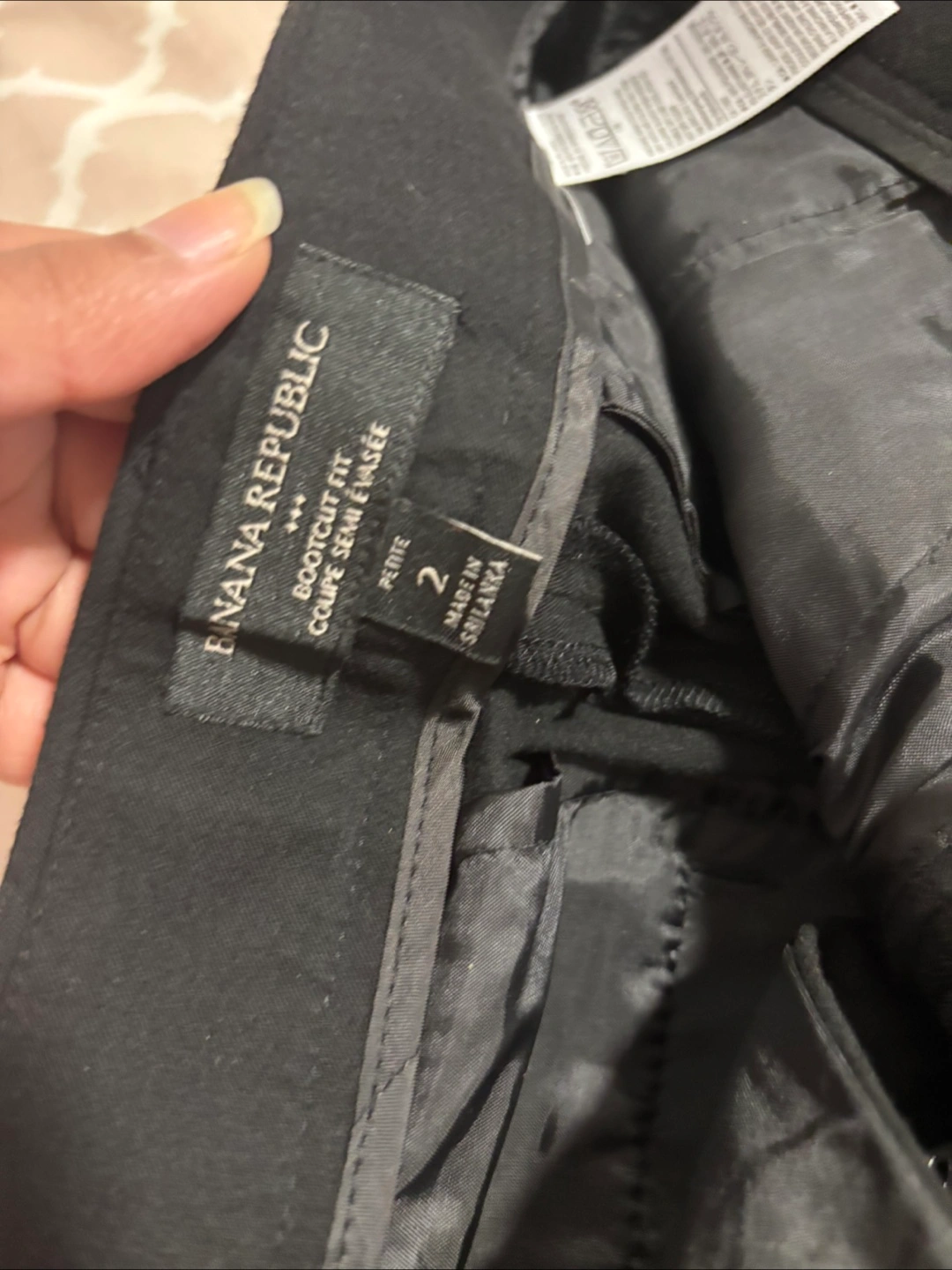 60Selling a pair of Banana Republic bootcut fit pants in black. They are a size 2 petite and in great condition! Perfect for work or going out. No tags but its brand new , never got chance to wear it. I work from home qnd then the size got changed . That was my fav pant but the only time i wore it was in the tryroom .