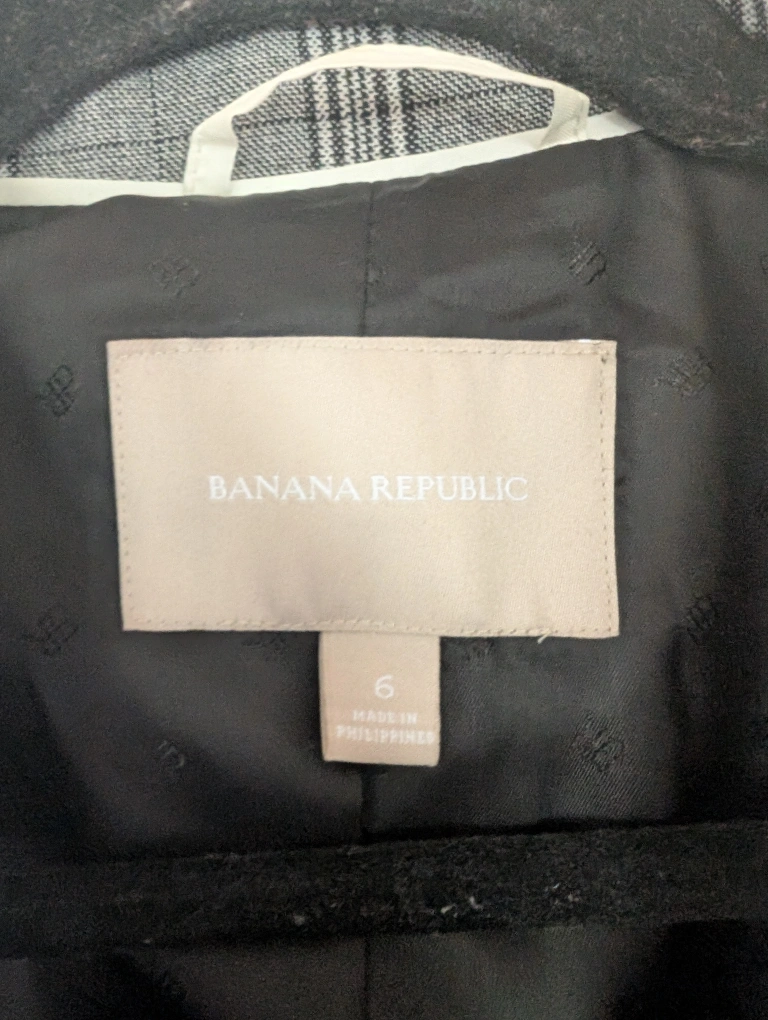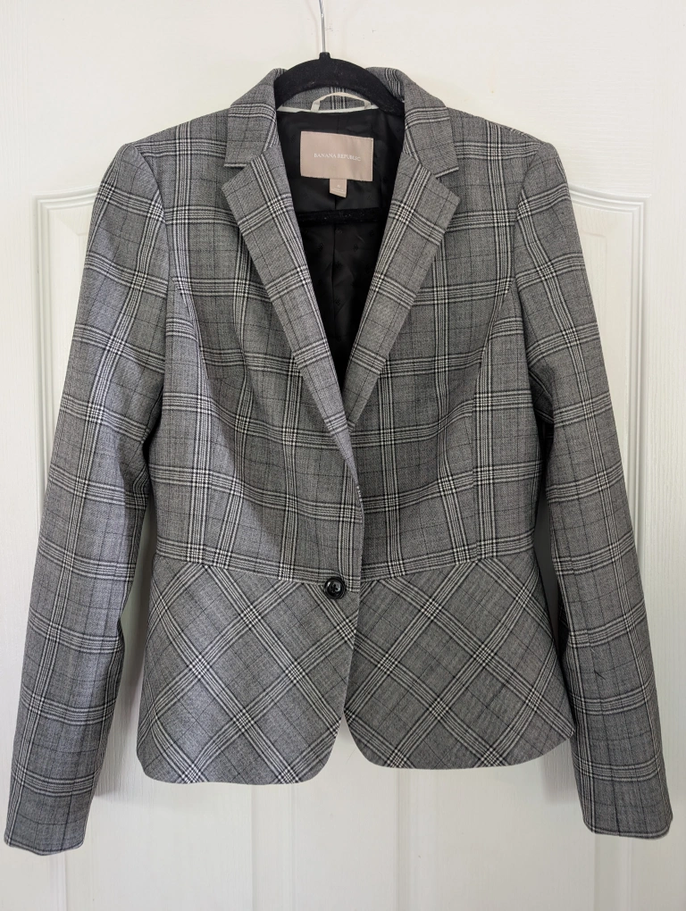 A nice, grey plaid blazer. Has a single button closure. The sleeves have buttons.