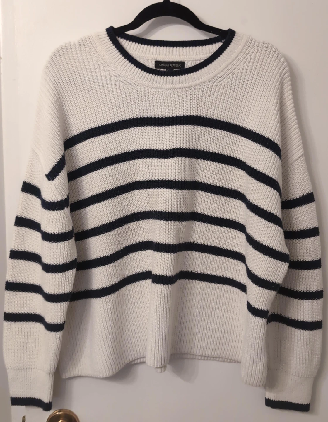10Banana Republic Oversized Striped Sweater – Size S White and navy striped 100% cotton knit with a relaxed, slightly boxy fit. Soft, comfortable, and easy to style. Gently worn, very good condition — clean, no stains or damage.