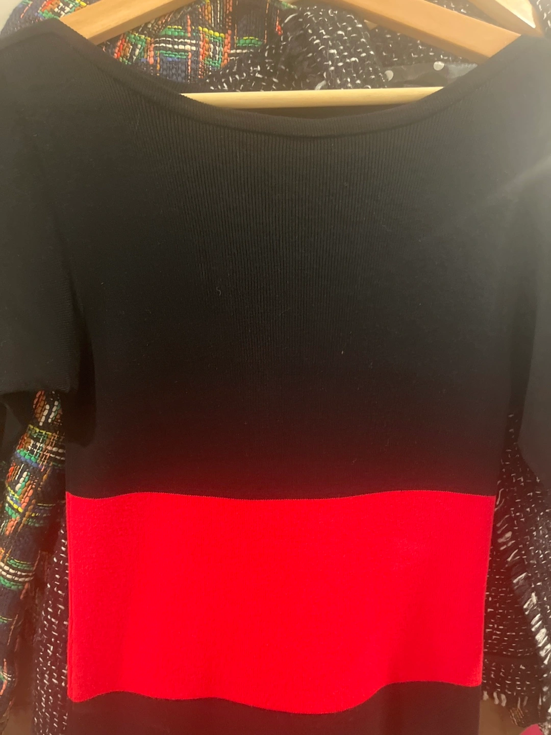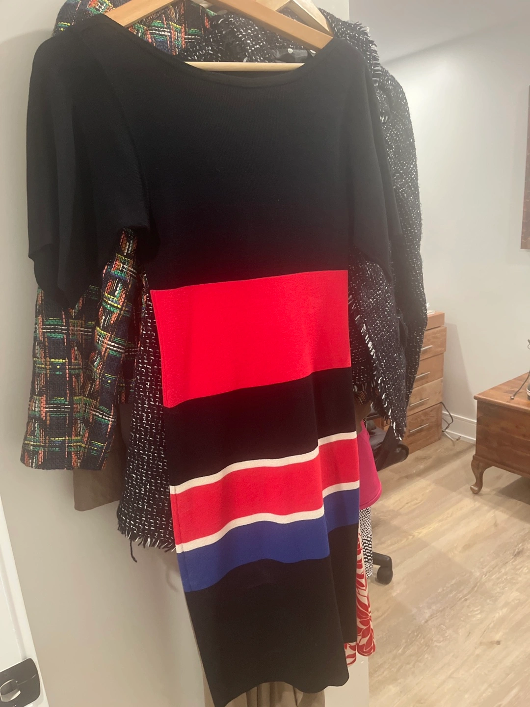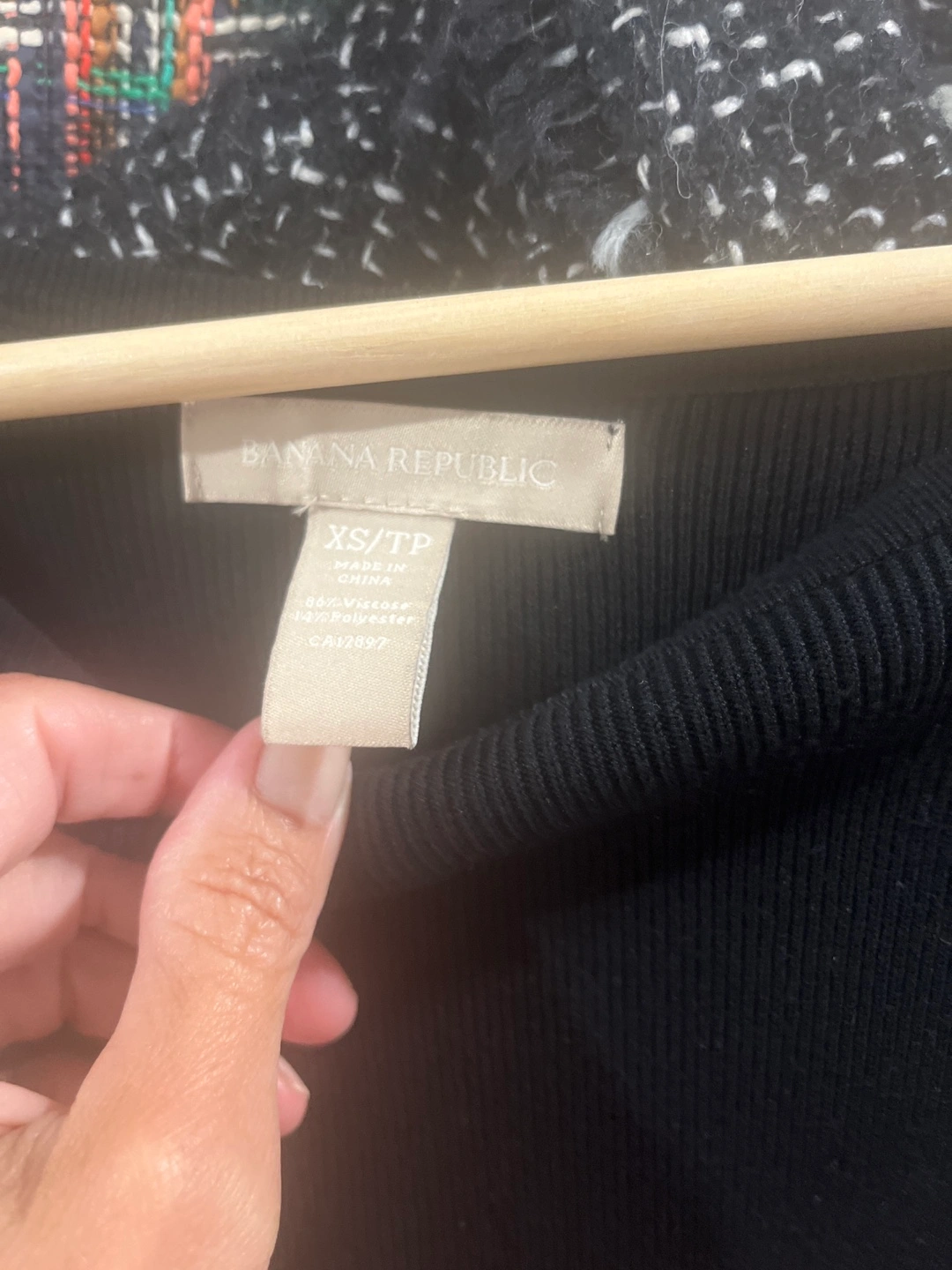 This is a Banana Republic dress in size XS/TP. The dress is black with red, white, and blue stripes. It's made of 86% Viscose and 14% Polyester.