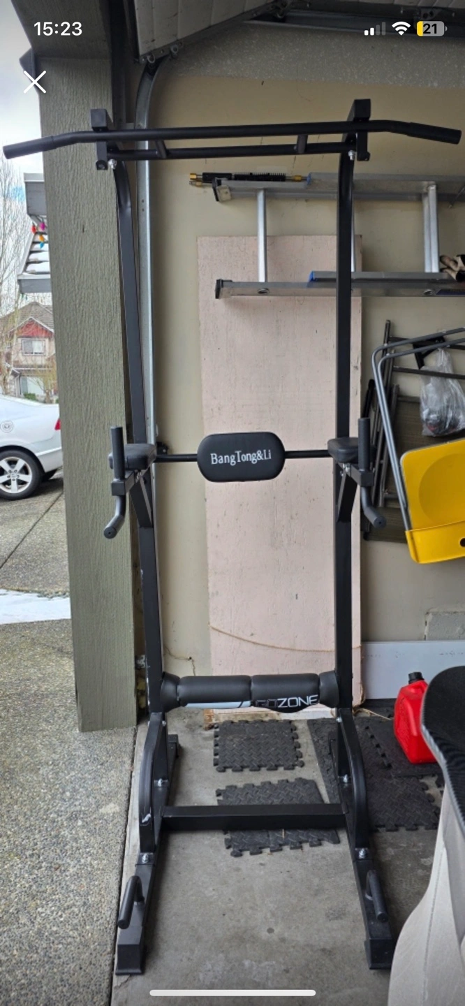 Sturdy power tower, great for home workouts. Features pull-up bar, dip station, and knee raise station. Good condition. Black finish. Height is 79inches and width is 36 inches
