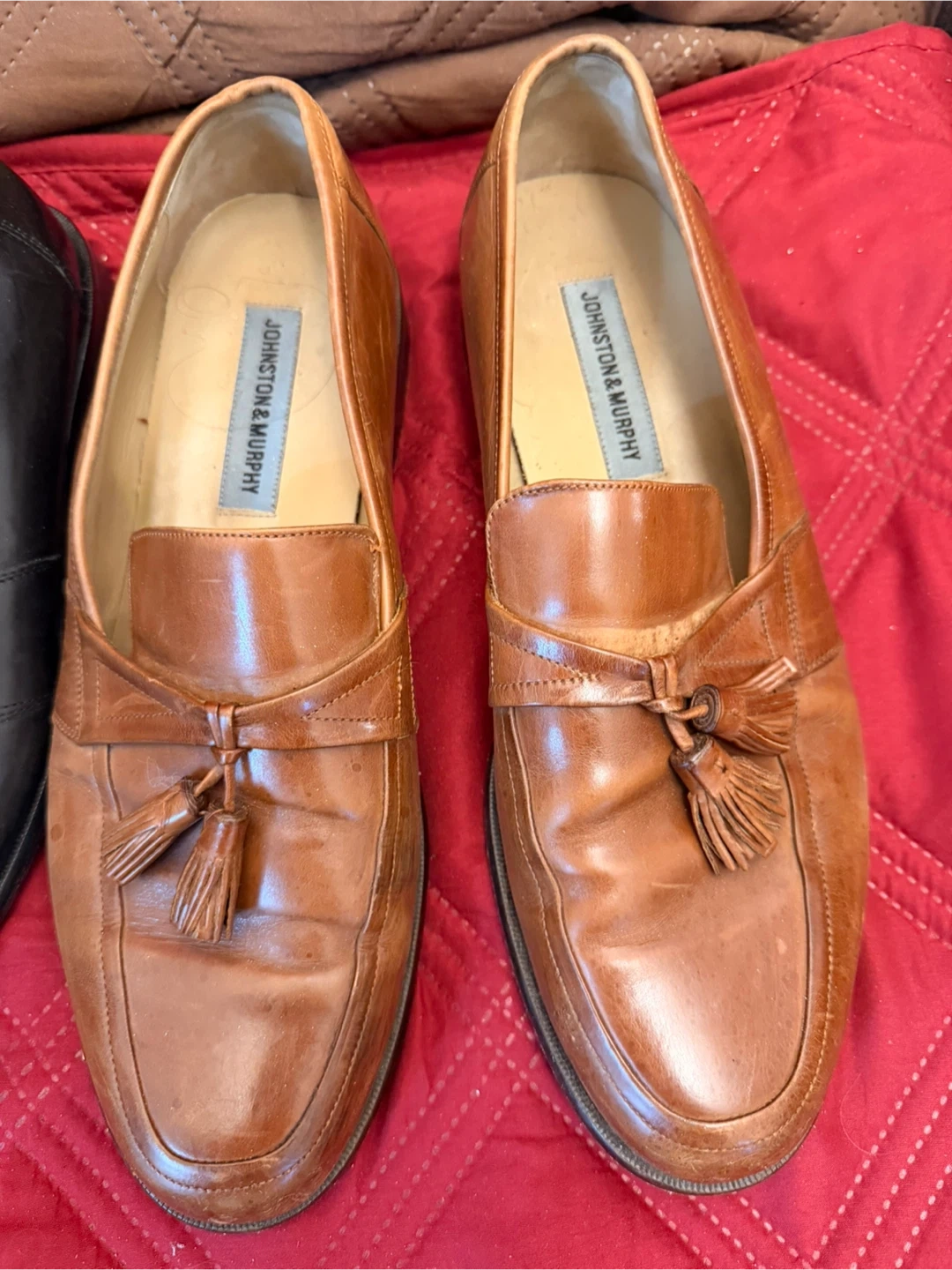 Brown leather tassel loafer shoes from Johnston & Murphy. These shoes are made of leather. They're a stylish choice for dress or casual wear.