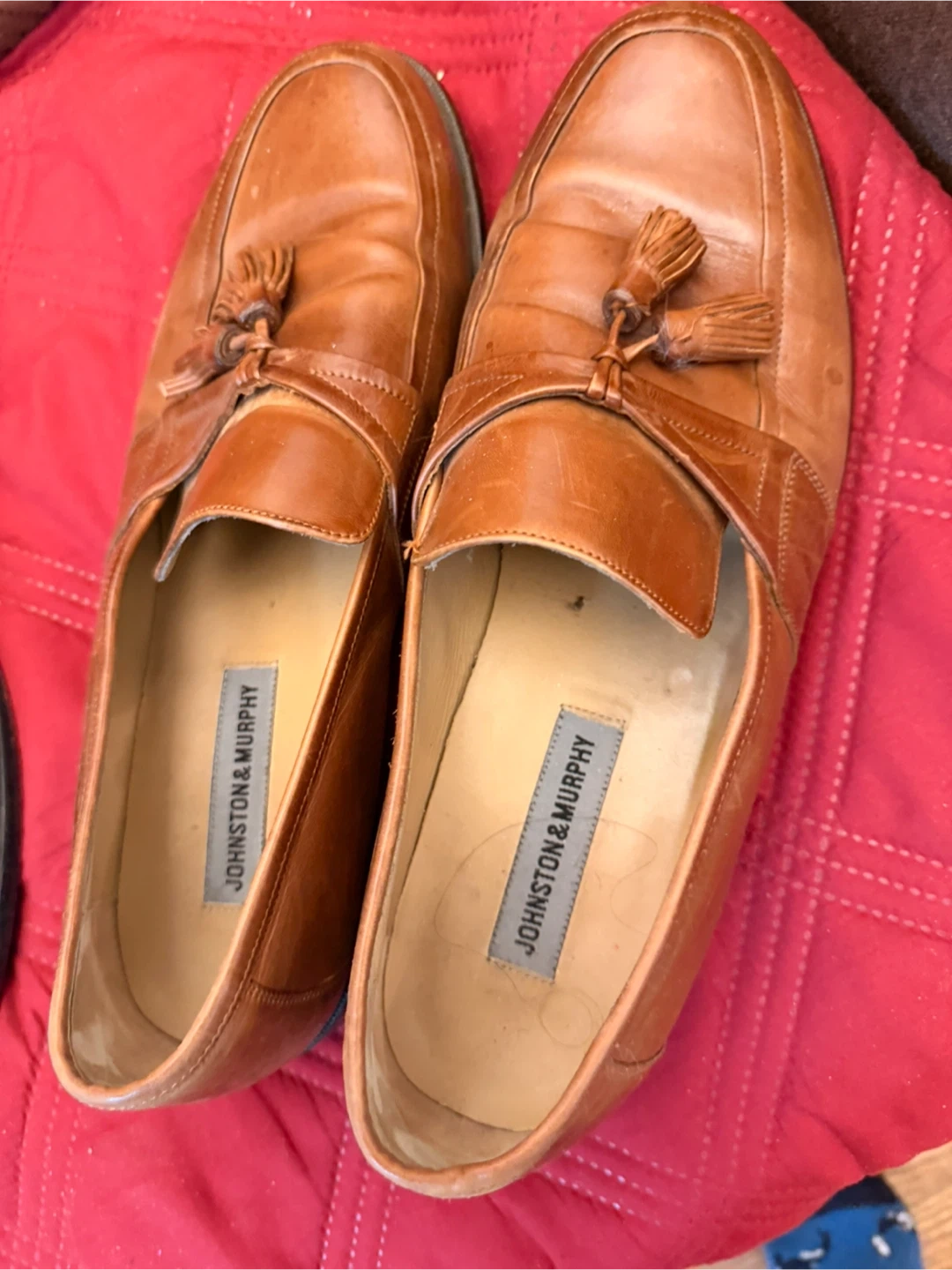 Brown leather tassel loafer shoes from Johnston & Murphy. These shoes are made of leather. They're a stylish choice for dress or casual wear.