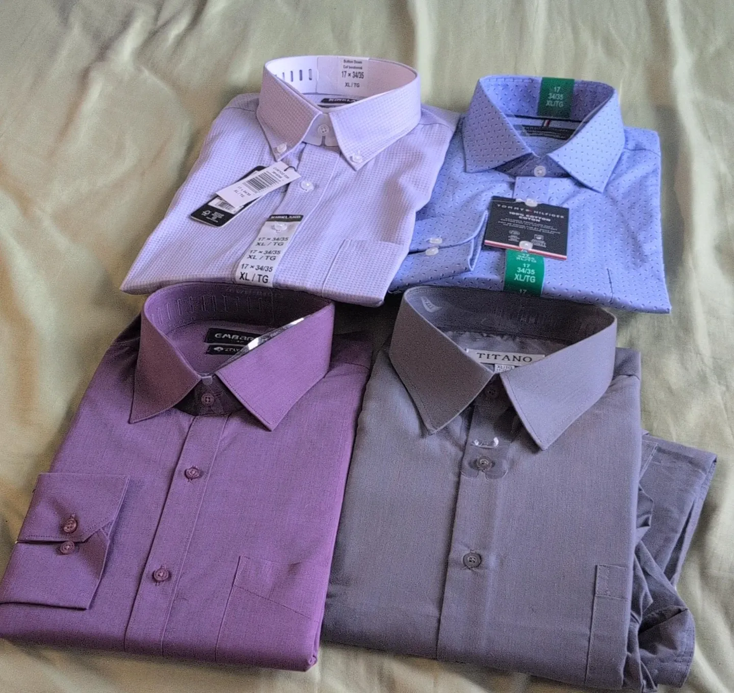 Bundle of four men's dress shirts. Includes brands like Tommy Hilfiger, Embar, and Titano. All shirts are size XL or TG with a 17-inch neck and 34/35-inch sleeve length. Perfect for work or formal occasions!